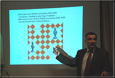 Der zweite "kongeniale" Festvortrag unseres englischen Freundes Tony Gillam (Bild oben) erwies sich als eine "nicht abgestimmte" - also rein zufällig zustande gekommene - Fortsetzung des ersten Vortrags! - denn Tony referierte über seine umfänglichen Bemühungen, die Partien zum Braunschweiger Schachkongress von 1880 ausfindig zu machen. Seine unnachahmliche Schilderung der Erlebnisse in Braunschweiger Archiven und Bibliotheken, in denen unser "Jäger und Sammler" der erbarmungslosen "deutschen Bürokratie" ausgesetzt war, welche ihn immer wieder ergebnislos hin- und her pendeln ließ, sorgte erneut für gehobene Stimmung. Als Fazit konnte er schließlich verkünden, dass er möglicherweise eine Person gefunden hat, die ihm die gesuchten Partien liefern kann - allerdings ist diese Aussicht mit einem großen "Maybe" verknüpft. Wir hoffen, dass Tonys Suche inzwischen von Erfolg gekrönt wurde.