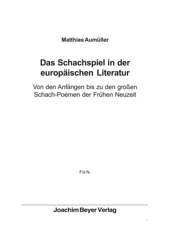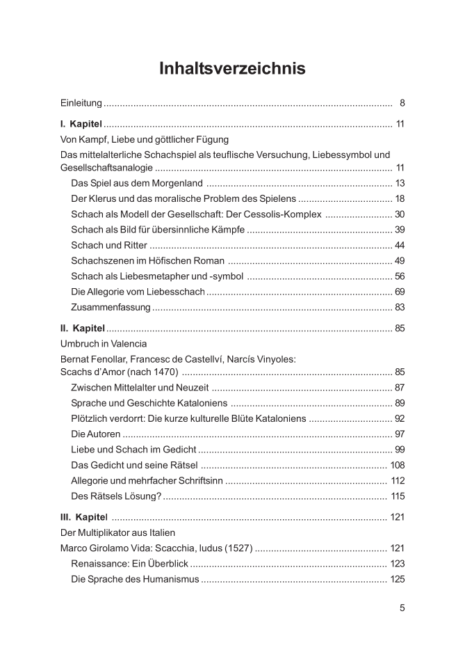 „Ein Streifzug durch die Literatur des Mittelalters und die Schachgeschichte der frühen Neuzeit, bei dem die Texte und wichtigsten Passagen ausführlich vorgestellt und im Kontext der Zeit erklärt werden“ (S. 8). Hinzu kommen Kapitel mit biographischen Informationen zu den Autoren sowie Mitteilungen zu den jeweiligen historischen Hintergründen. Selbstverständlich bietet der Autor auch fundierte Interpretationen an.