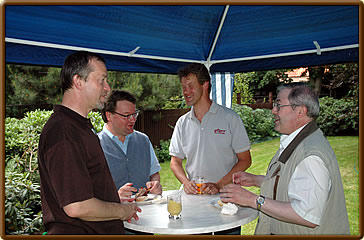 Mit von der Partie waren auch Christoph Schneider und der dänische Schachfreund Blohme sowie Herr Graf vom SV Salzgitter, dessen Vorsitzender (zugleich unser Mitglied) Matias Jolowicz das Spielmaterial zur Verfügung stellte. Zahlreiche "Schlachtenbummler" umsäumten anfangs das Geschehen, später versammelte man sich dann eher ums Bierfaß.