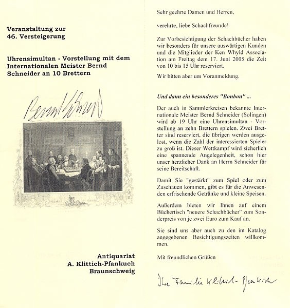 Wiederum war es die Familie Klittich-Pfankuch, die nach Juni 2001 (Simultan von Lothar Schmid) und November 2003 (Gründung der KWA) mit einer Rahmenveranstaltung die 46. Auktion am 18.06.2005 für uns Sammler von Schachliteratur besonders attraktiv machte. (Flyer im Vorschaubild oben zur Vergrößerung anklicken!)
