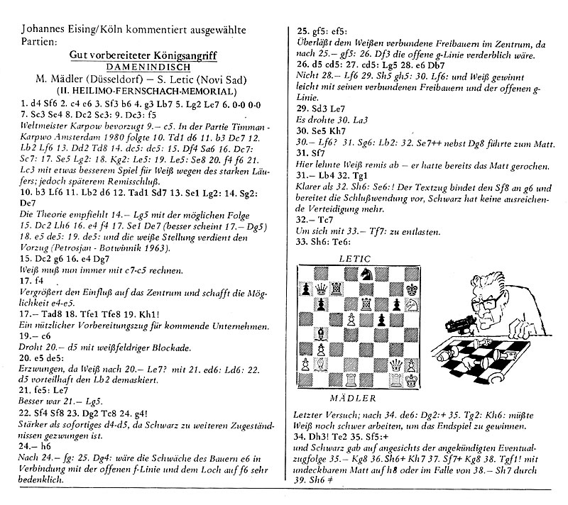 Unser zweiter Geburtstagsgruß führt in die sächsische Landeshauptstadt Dresden, wo Manfred Mädler zur Monatsmitte (am 15. Juli) auf 73 Jahre zurückblicken konnte. Das Traditions-Schachhaus, das man unwillkürlich mit seinem Namen assoziiert, kann inzwischen beachtliche 35 Jahre vorweisen, seit nunmehr 11 Jahren ist es im alten Villenviertel von Dresden-Blasewitz angesiedelt. Da wir Fotos von Manfred bereits mehrfach verlinkt haben, soll diesmal das Schachhaus an der Reihe sein (Bild unten) - der Schachladen befindet sich im (leicht erhöhten) Erdgeschoss. Mit einer kleinen Zugabe erinnern wir zudem an Manfreds Fernschach-Aktivitäten, hier seine überzeugende Gewinnpartie gegen Stevan Letić aus dem II. Heilimo-Fernschach-Memorial, kommentiert von Johannes Eising in der Rochade 197, Dezember 1980.