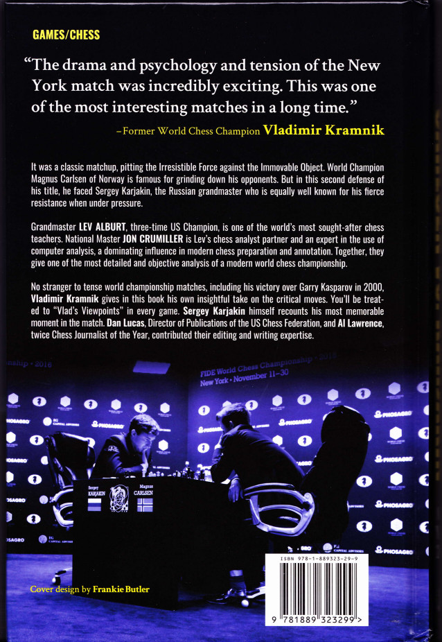 Jon Crumiller and GM Lev Alburt have published a most interesting book on the World Championship Match between Magnus Carlsen and Sergei Karjakin last winter in New York City. As Bob van de Velde and I had the opportunity to visit that match during it´s desicive state, but also our friend Jon in Princeton, it is a nice remembrance to that trip.