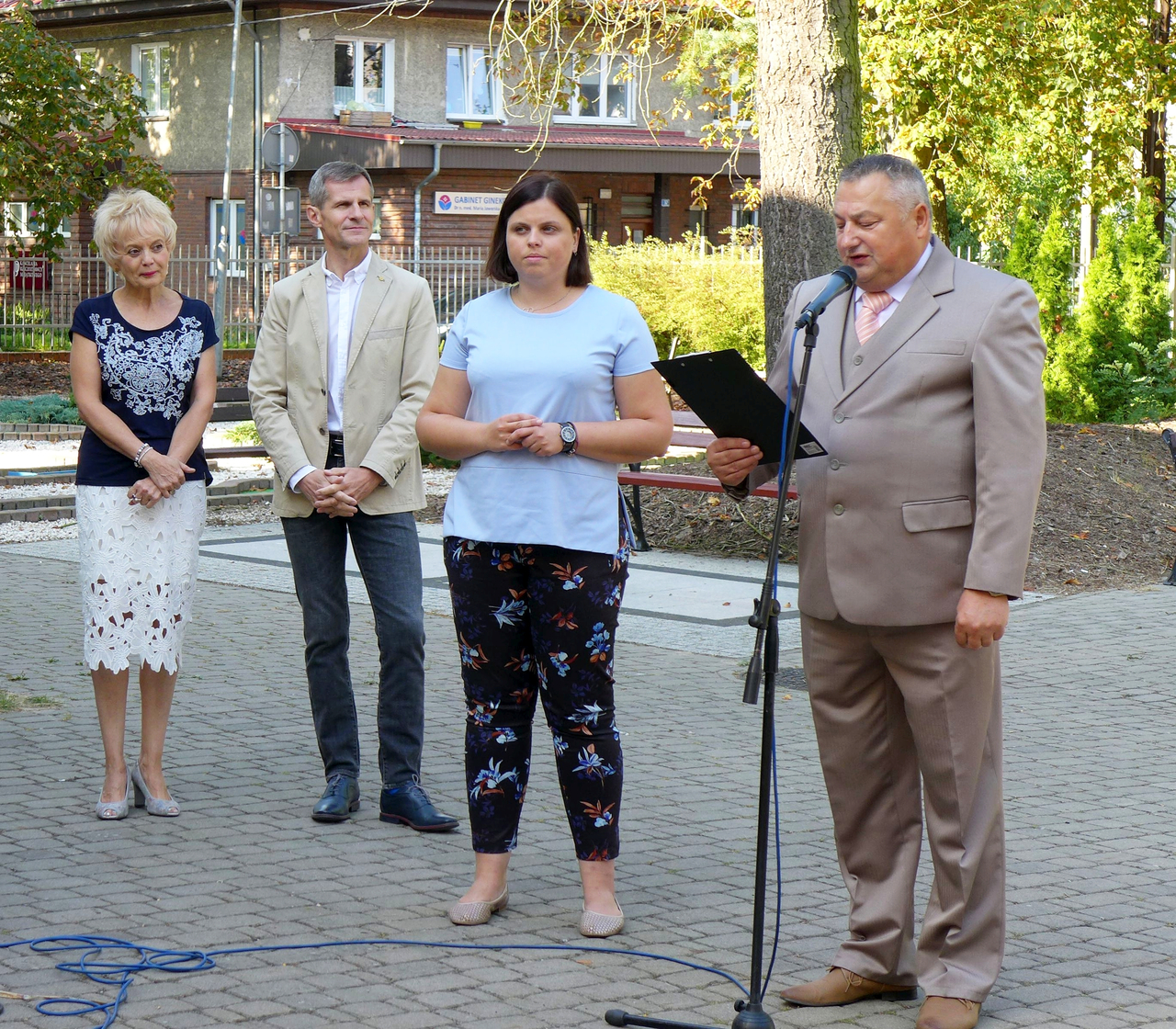 Brygida Liśkiewicz (Head of Barlinecki Osrodek Kultury), Mayor Darius Zielinski, Magdalena Walaszczyk (Interpreter), Krzysztof Wolski (Club President Barlinek chess club)