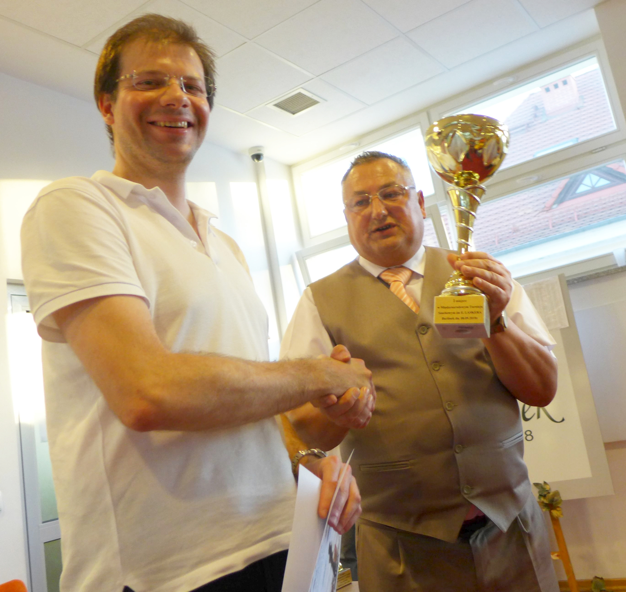Tournament winner Adam Czuchnicki receives the trophy from Krzysztof Wolski