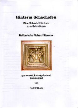This is a very attractive small book, with a nice get-up and a bibliophilic layout (color print on slightly colored paper). The well-known bookplate of R. Glenk (Kachelofen / tile stove) was reproduced as frontispiece and an additional photo of R. Glenk on the title page. There is a further bookplate reproduced on the last page inside [22] as well as a smaller one stuck on the front inside cover. The 10 existent copies have been distributed to chess friends of Rudolf Glenk.