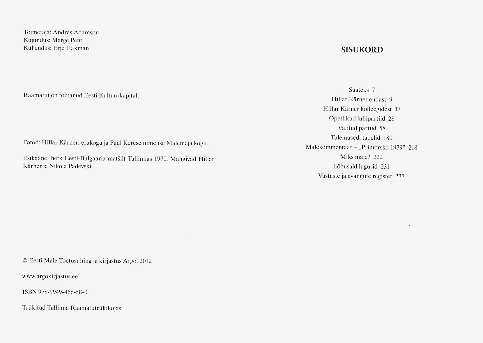 Hillar Kärner, born 27 July 1935 in Tallinn, International Master 1980; for decades he belonged together with IM Iivo Nei to the best Estonian chess masters behind the legendary Paul Keres. Hillar Kärner has played many unforgettable and spectacular games, the book contains a selection of 200. He could win single games against world champions Mikhail Tal and Anatoli Karpov, and also a win against Paul Keres is included in the book. Moreover you will find important results and tables, a short biography (interview), memories of comrades, etc.