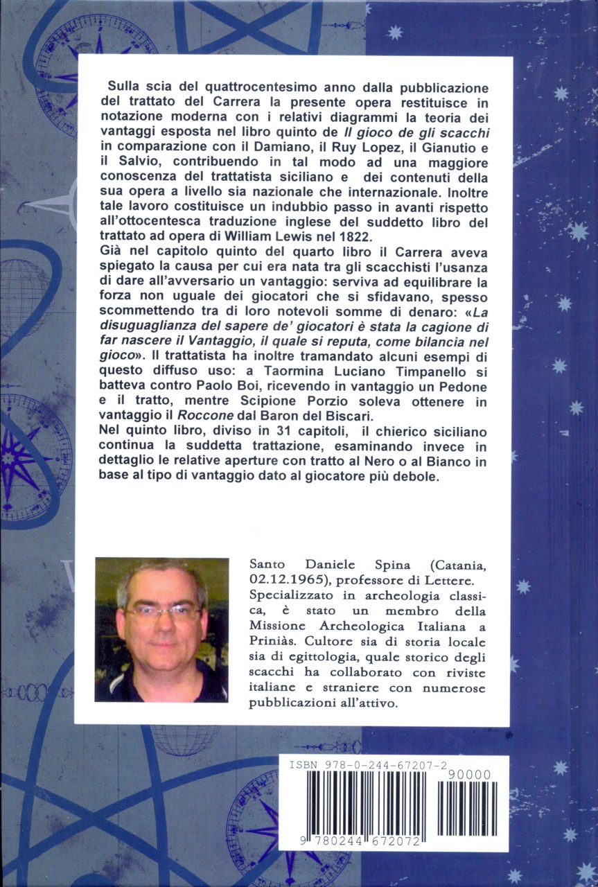 In the wake of the four hundredth anniversary of the publication of the Carrera's Treatise on Chess (1617), Santo Daniele Spina's writing presents in modern chess notation with many diagrams the odds theory exposed in the fifth book of Il gioco degli scacchi (The Game of Chess) in comparison with Ruy Lopez, Gianutio and Salvio and it is another step forward with regard to English translation by William Lewis (1822).