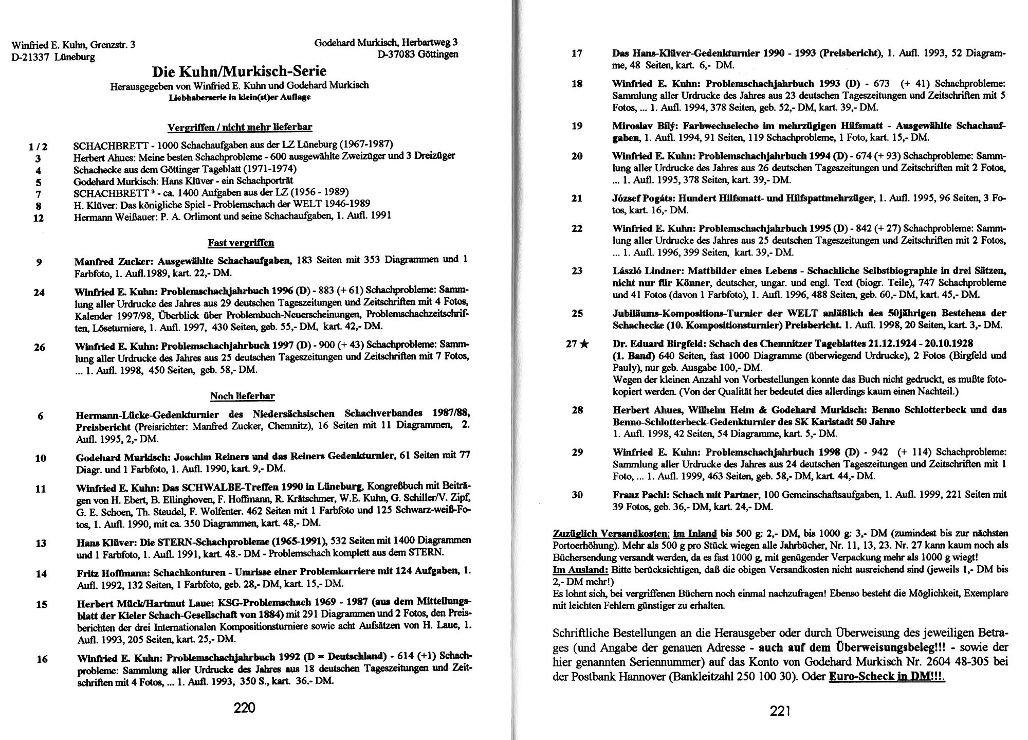 A German publication on the subject "problem chess" undergoing a third revised edition may be nearly considered as a singularity! The attractive paperback is filled with 300 well-chosen tricky problems (1st ed. Munich 1980; 2nd ed. 1982; 3rd ed. 1985, 224 pp.) – time and again you will just like to pick up this small classic. Godehard Murkisch founded his own publishing house in 1999: Nightrider Unlimited.