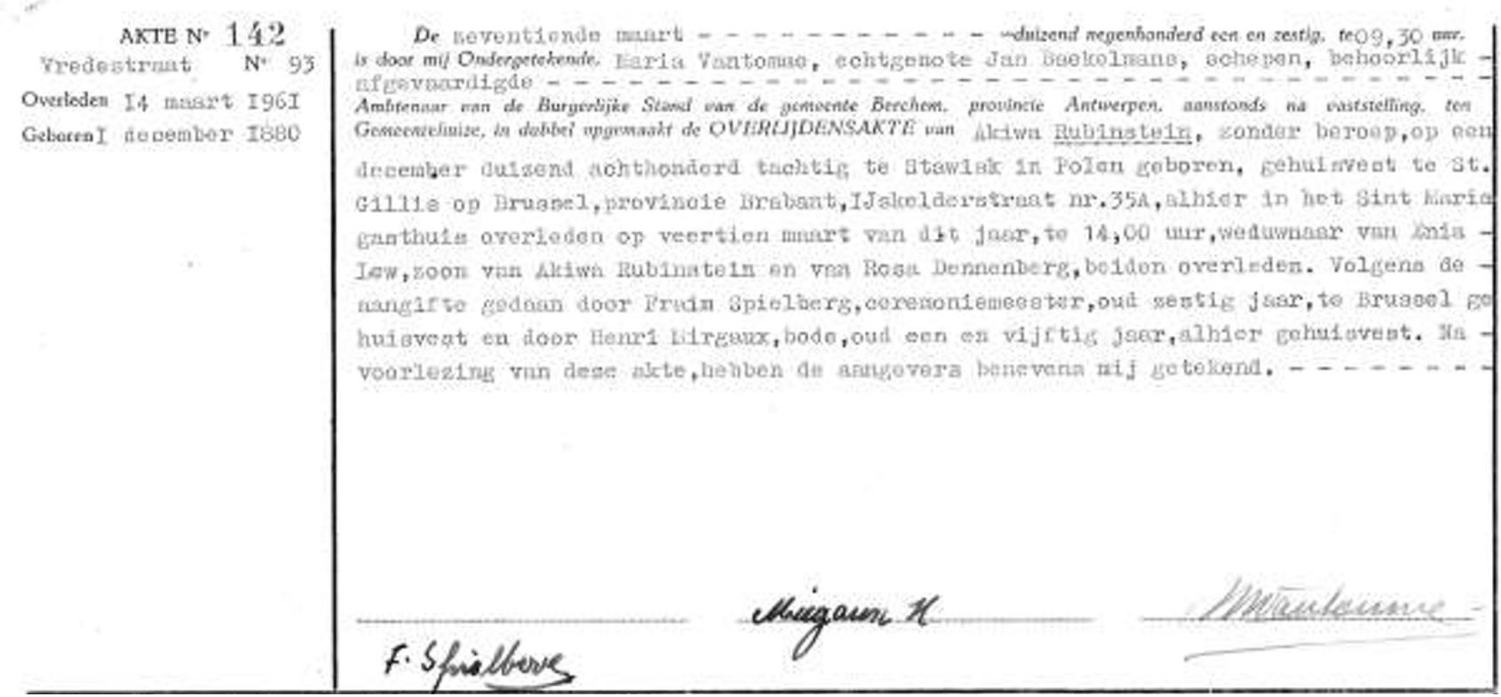 The well-known Belgium chess historian Hans Renette, the author of inter alia thoroughly researched biographies on Henry Bird and Louis Paulsen, has solved the problem of the correct date of Akiwa Rubinstein’s death. He has sent us a copy of the official death certificate: