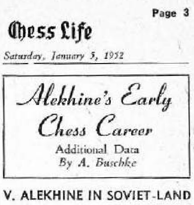 Dr. Albrecht Buschke, the German Jew who emigrated to the USA in 1938 with a huge collection of chess books, letters, autographs and magazines, wrote many columns in the 1952 American chess magazine Chess Life called: Alekhine’s Early Chess Career. Additional data by A. Buschke. V. Alekhine in Soviet-Land. He claimed that the 1921 versions of Das Schachleben in Sowjet-Rußland were either edited or shortened by the publisher Bernhard Kagan: