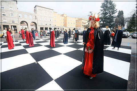 On Sunday, 15 February, Luca has contributed to the - as far as he knows first - living chess performance in South Tyrol: In the presence of the mayor the game Grünfeld - Rubinstein, Meran 1924 was staged on the Piazza della Vittoria (Victory Square, Siegesplatz). Luca has commented on the moves and also quoted from his book. And the mayor who plays chess as well even bought a copy ...