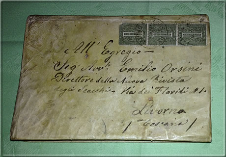 Photo 1: This is how a 1526 Damiano was sent through the Italian mail around 1890: 'Dear Mr. Orsini, could you please inform me whether this book has any value?' The stamps and address are actually on the cover of the book! -