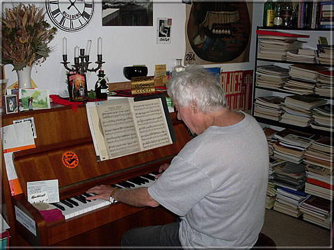 Apart from his main collecting field, Godehard still owns countless other books on chess as well as on (natural) sciences and humanities, especially he has intensely dealt with philosophy (Wittgenstein, Schopenhauer). Another passion is directed at music, Godehard is a fan of Rhythm & Blues of the fifties /sixties and he also plays the piano, as is proved by the following photo.