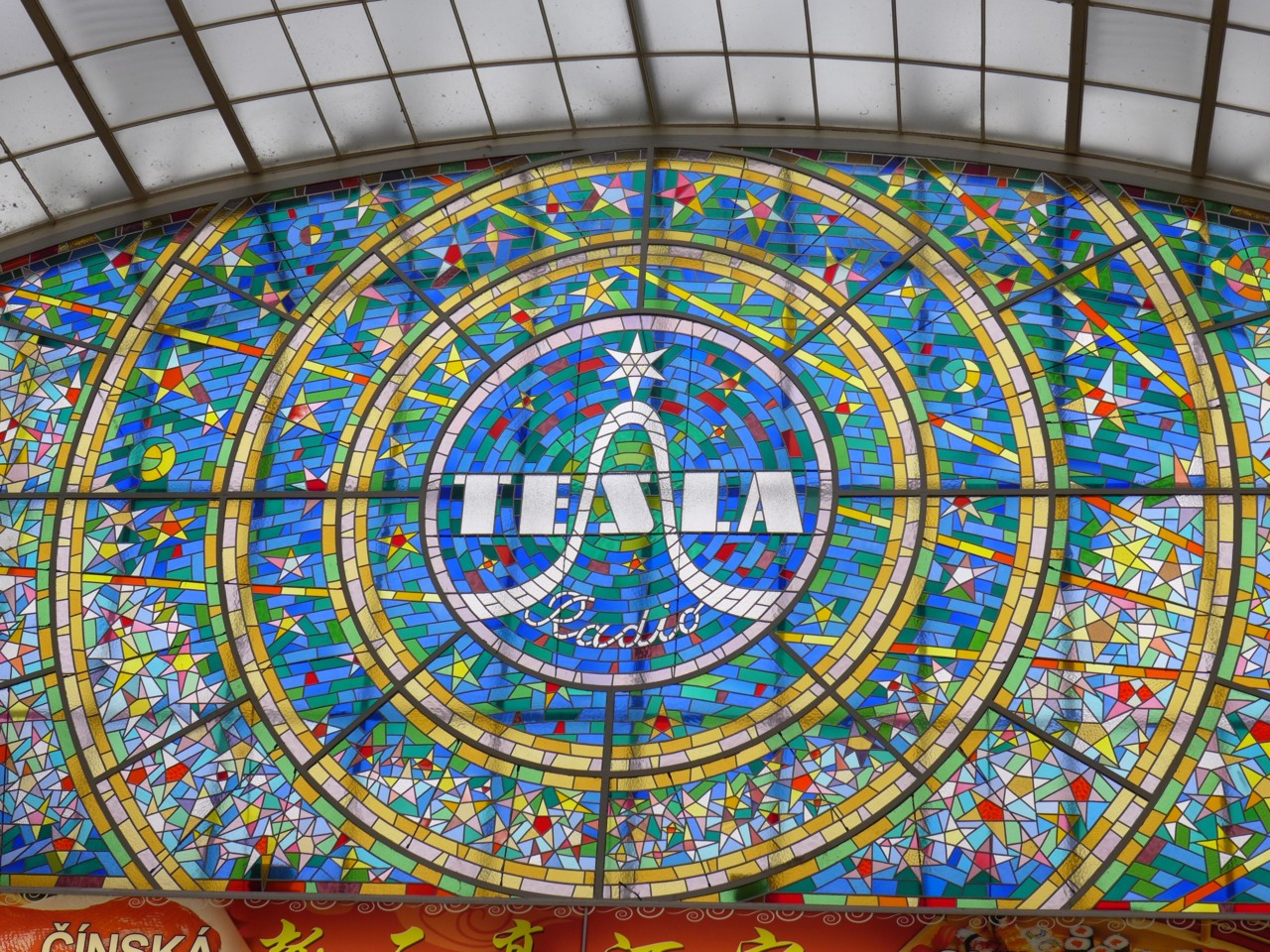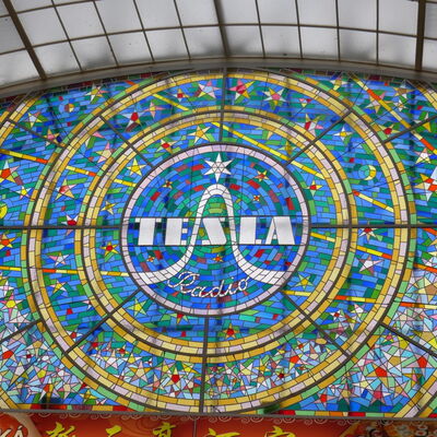 Michael NegeleStained glass with logo of Tesla Radio in Pasáž Světozor, Prague 2015 -