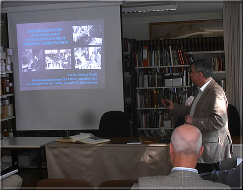 Michael Negele gives his lecture on the history of blindfold chess: "Rekordleistungen im Blindschach – Eine Zeitreise durch dreizehn Jahrhunderte"