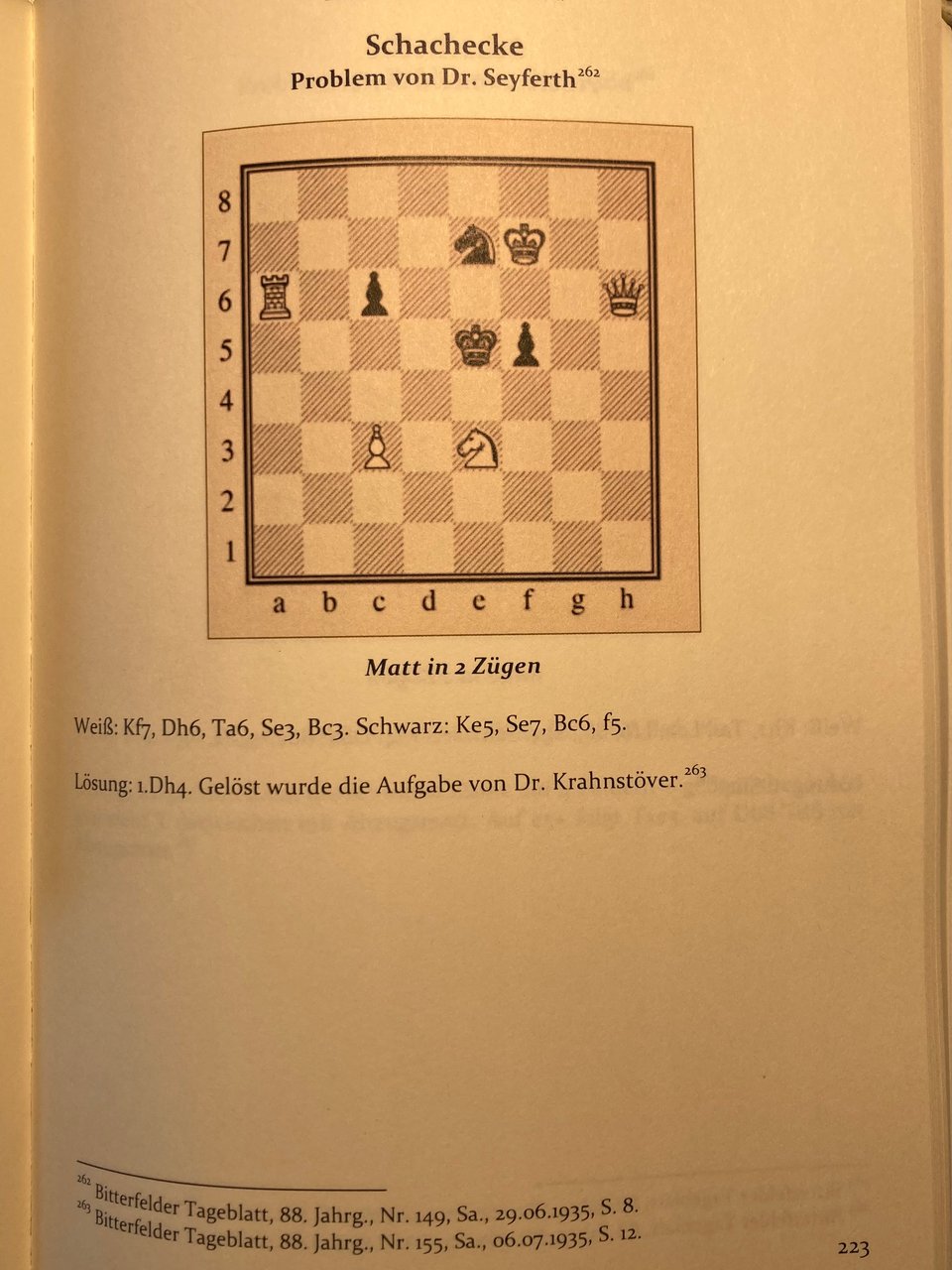 A wealth and variety of problem chess from the Bitterfelder Tageblatt, expertly explained by Dr. Ralf Jürgen Binnewirtz in his foreword. Ralf J. Binnewirtz also checked the individual “lightweights” for their coherence. In the appendix, p. 333ff, he provides a “historical excursus on the Chinese family” in order to gain “clarity on the development of the Chinese pieces in problem chess”. The reason for his reflections was the discovery of the “Paoma” article by Prof. Dr. P. Seyferth from Bitterfeld in 1936.