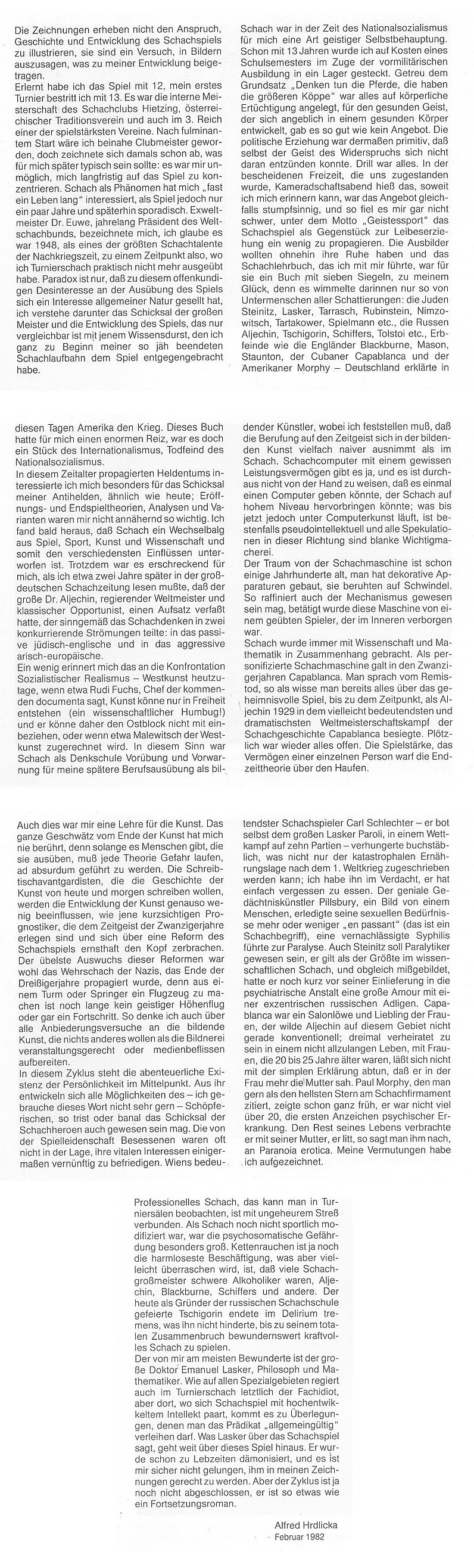 Hrdlicka expressed his views of chess in an exhibition catalogue of the Gallery Pudelko (Bonn, 1982), for him Emanuel Lasker was the "Greatest": Hrdlicka's explanations from 1982 (see image; in German).