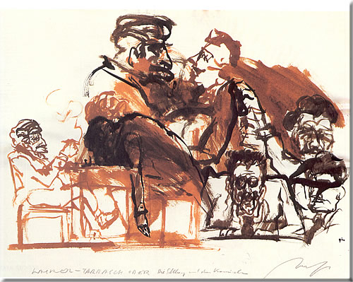 Therefore his impressive brush drawing (in sepia and black Indian ink, 48.5 x 66 cm) "Dr. Lasker gegen Dr. Tarrasch oder Die Schlange und das Kaninchen" [Dr Lasker against Dr Tarrasch or The Snake and the Rabbit] from the above volume will be presented here for lasting remembrance.