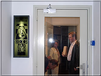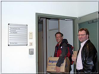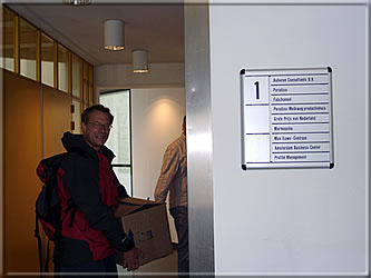 Bernd Schneider, Jurgen Stigter and Peter de Jong posing at the entrance to the MEC. Below you see the nameplate beside the door. -