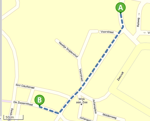 The map below shows how to walk from the tournament hall De Moriaan (=A), Dorpsduinen 4, to the chess shop in De Zwaanstraat (=B).
