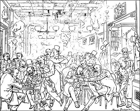 From the caption: "… Leopold Hoffer, with bald head, sits at extreme left, while the Reverend W. Wayte at a nearby table plays Zukertort, as the Reverend MacDonnell leans on the latter’s chair. Blackburne, with pipe in mouth, stands near the gentleman with top hat and cigar. Steinitz, at extreme right, removes his overcoat. There is still a Simpson’s to this day, but unfortunately chess is no longer played there."