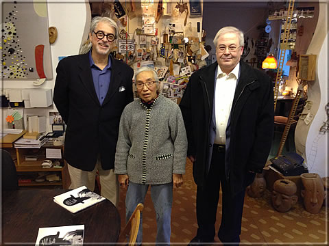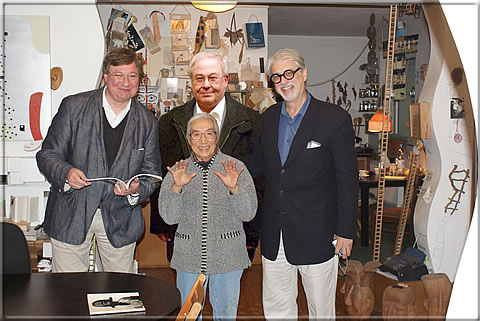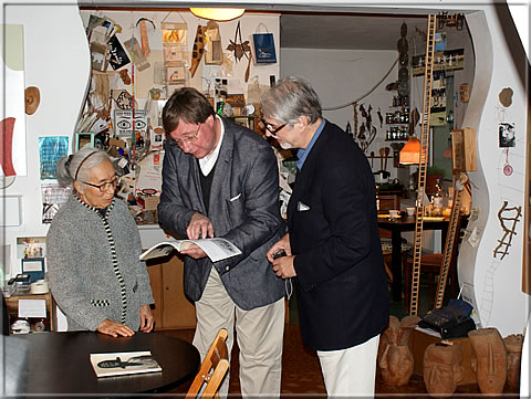 Takako Saito kindly showed us her large studio with all her fascinating works of art, many of them not displayed at the a.m. exhibition in Moers. In spite of her age Takako (*1929) is still very active as an artist, and as many of her pieces of art are made (partly) of wood, she still works herself on the material with help of a workbench and a power drill standing in one of her studio rooms. Certainly each visitor will find his own favorite(s) among her works, for Wolfgang Angerstein it was a "Wippe-Schachspiel" (seesaw chess) which he immediately became attached to… And we were especially pleased when Takako presented us each with an autographed copy of her catalog published in 1989 (see the below scan of the cover).