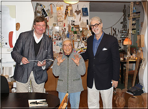 Larry had come to our regional capital from Spain and had to depart again on Saturday morning (12th of October) for Paris. His main concern in Düsseldorf was to meet the Fluxus artist Takako Saito (see our last year’s report Seewerk Exhibition) to discuss with her the prospect of organizing an exhibition of her work in the United States where Takako has widely fallen into oblivion. Therefore the Friday evening crystallized as only date for a mini KWA meeting, we (i.e. Prof. Wolfgang Angerstein and your KWA webmaster) arrived at Takako’s studio at about 6 pm to be heartily welcomed by her and Larry. Unfortunately Michael Negele – much to his regret – couldn’t join us there, he was too late back in Friday night from a business trip to France (Lyon): therefore he could meet Larry only briefly the next morning in his Düsseldorf hotel before the latter had to leave for Paris.
