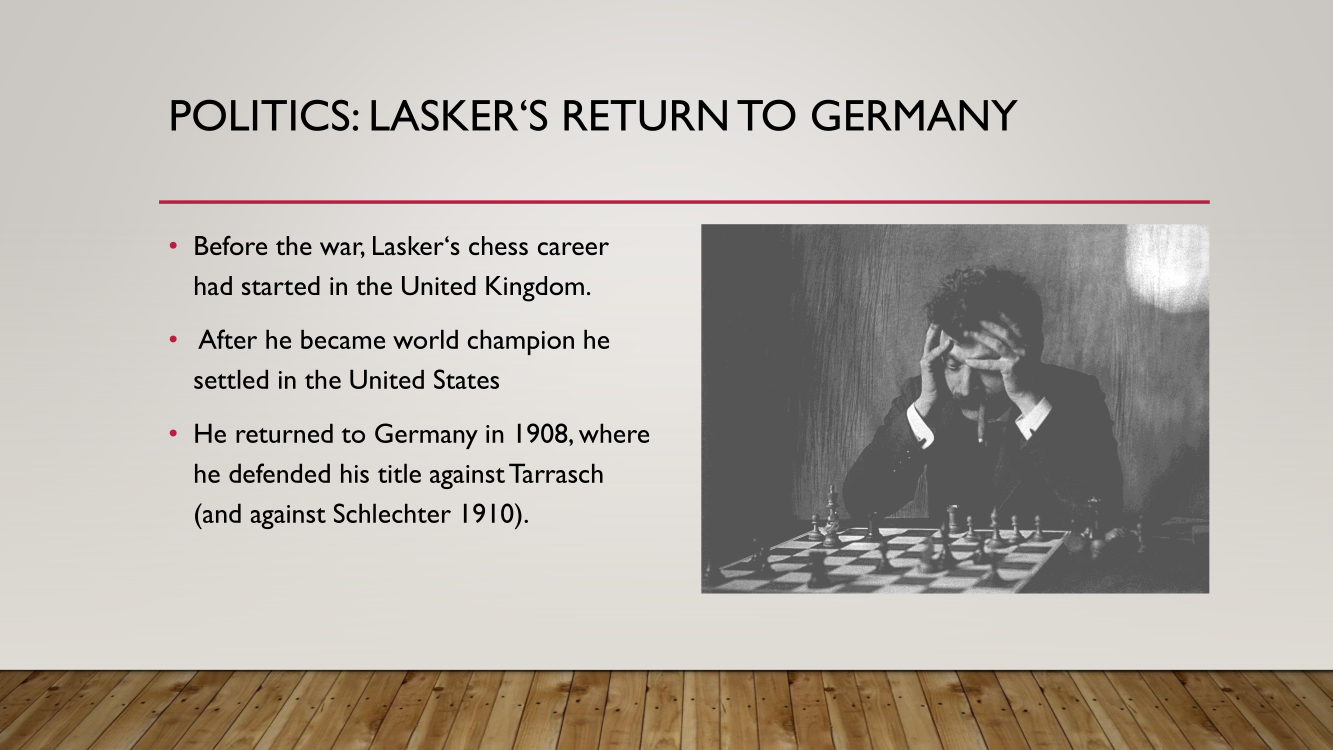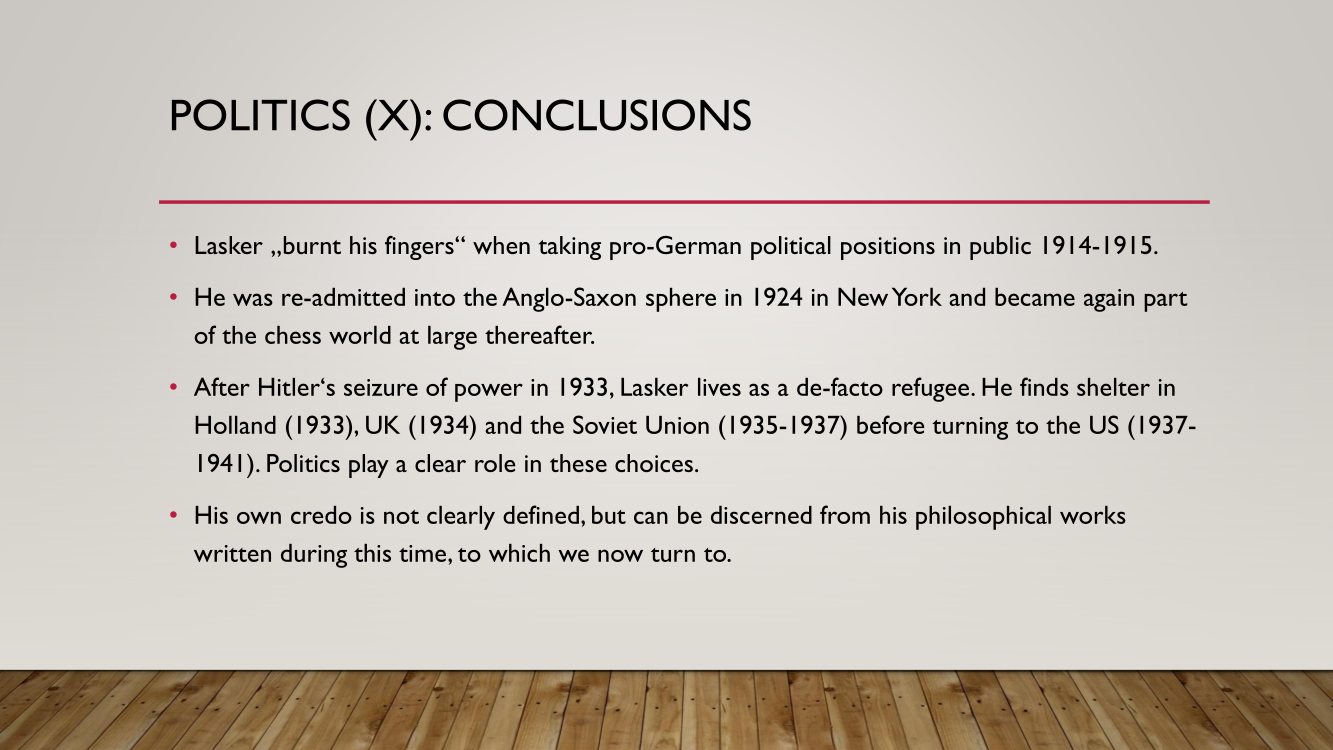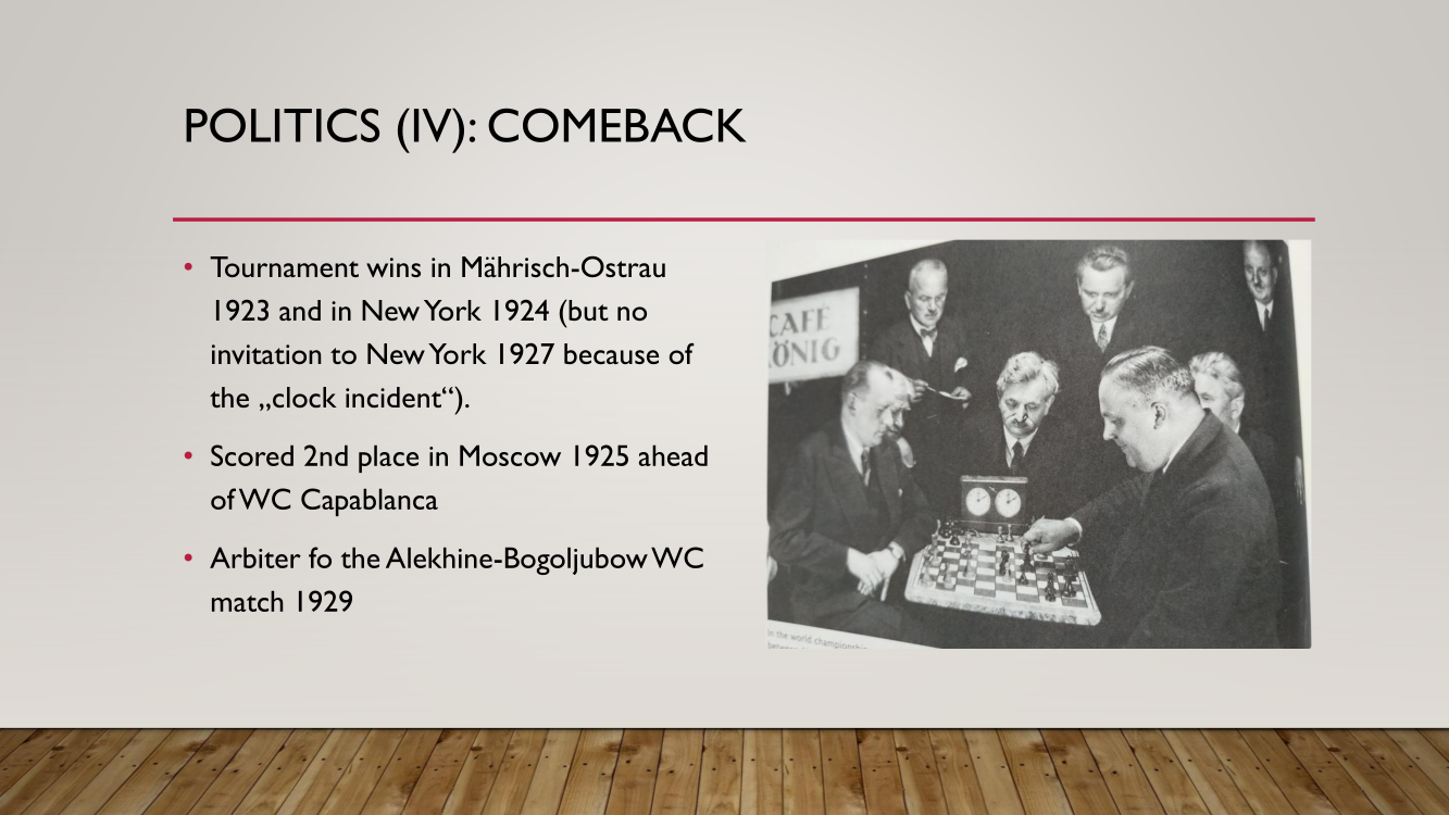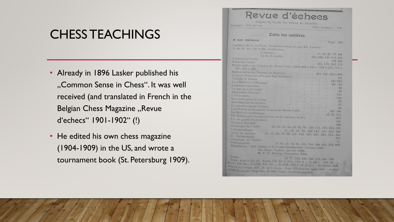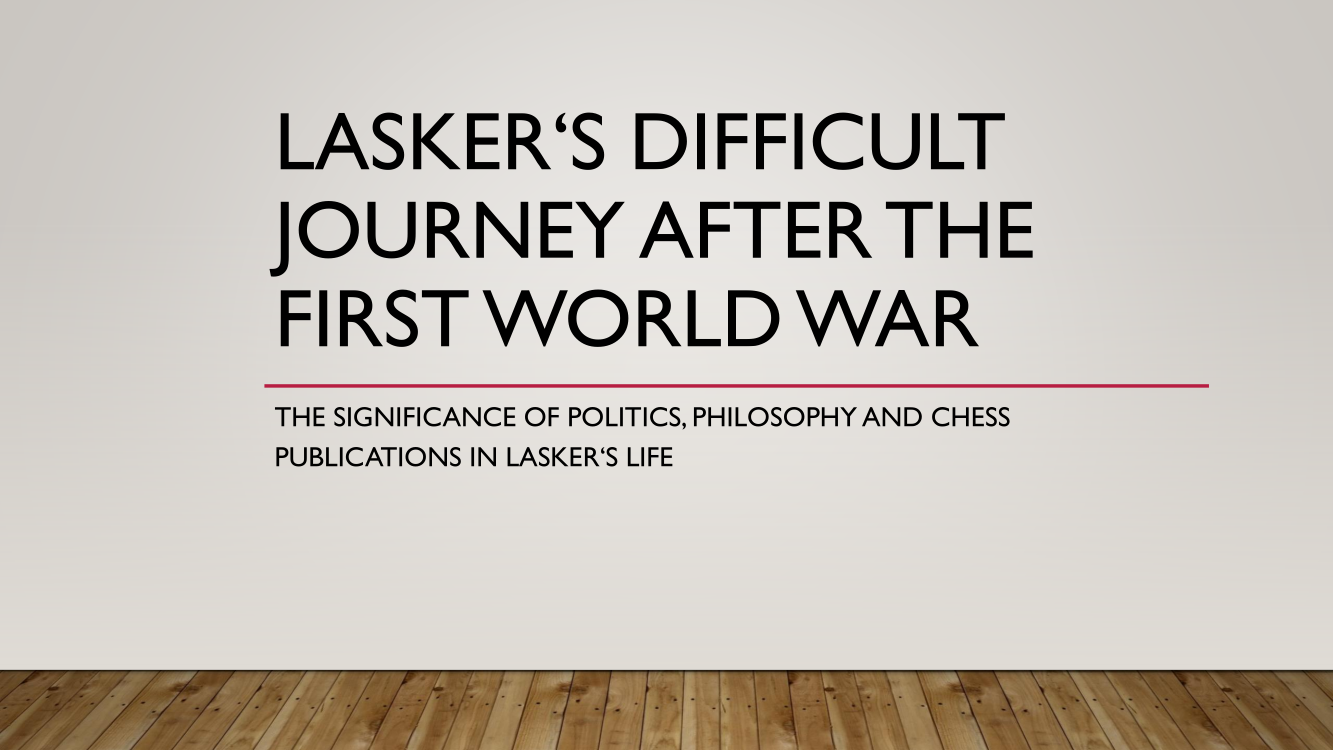 Frank presented the lecture "Lasker's Difficult Journey after the First World War" by Frank Hoffmeister, of which you have the support below.