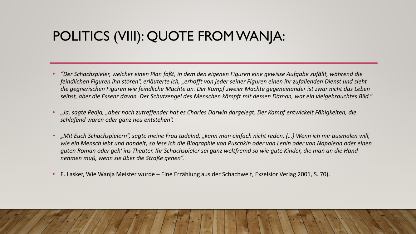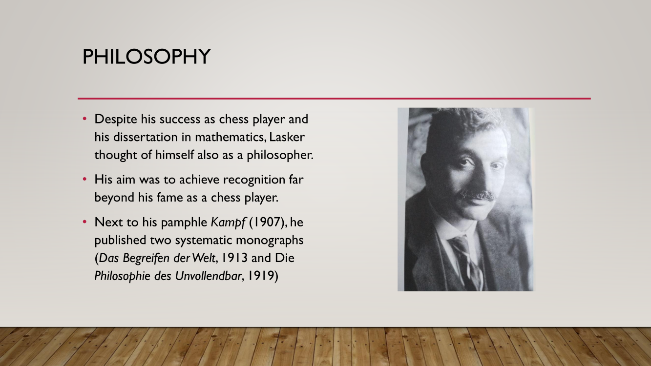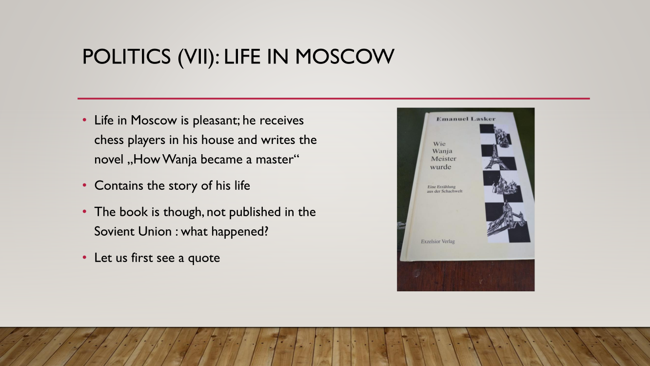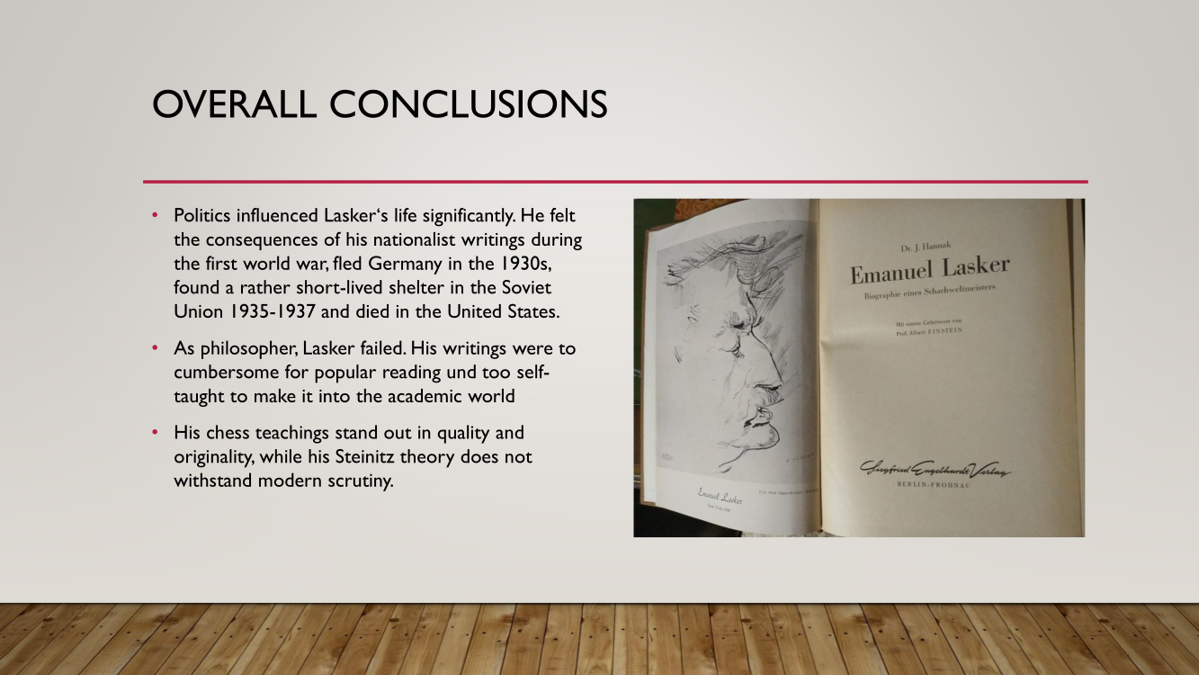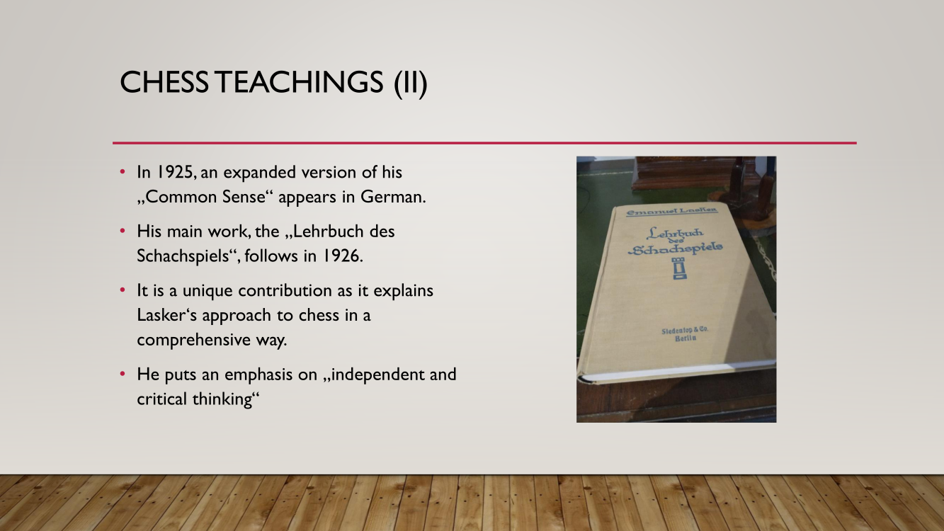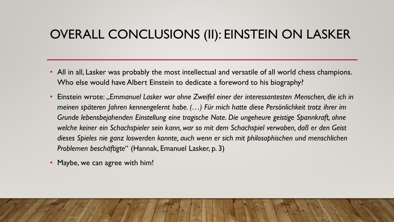 Frank presented the lecture "Lasker's Difficult Journey after the First World War" by Frank Hoffmeister, of which you have the support below.