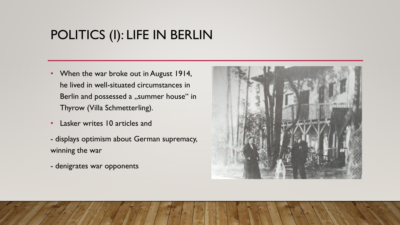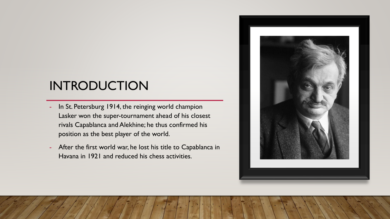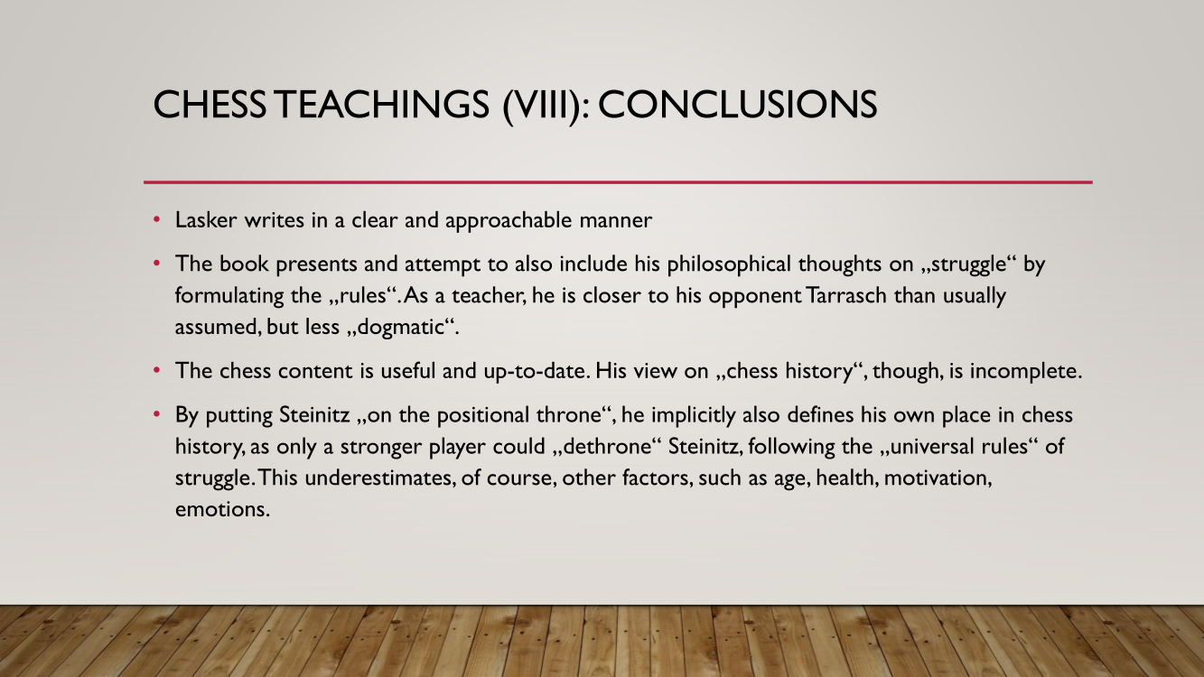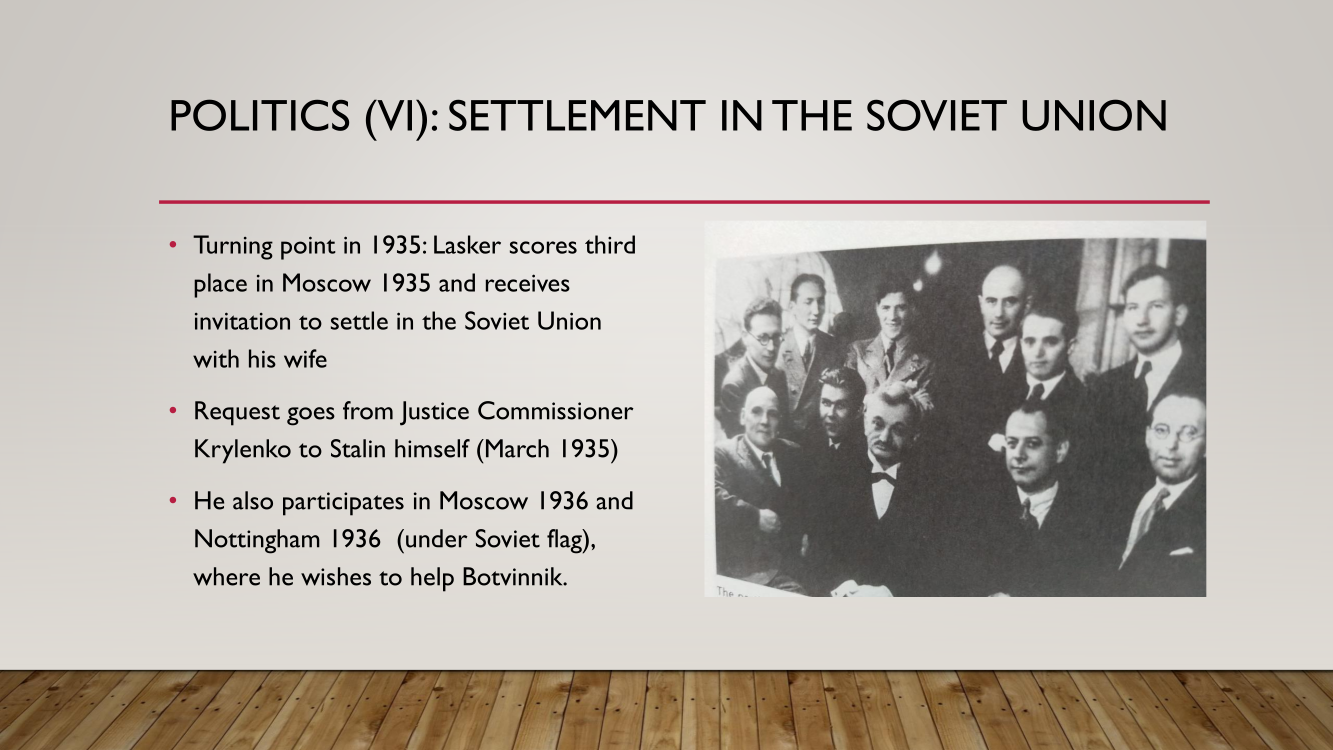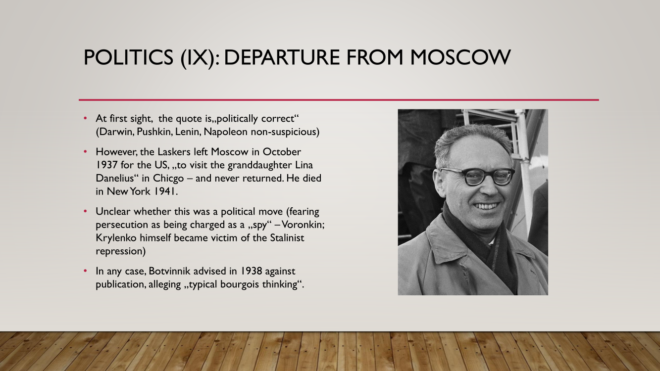 Frank presented the lecture "Lasker's Difficult Journey after the First World War" by Frank Hoffmeister, of which you have the support below.
