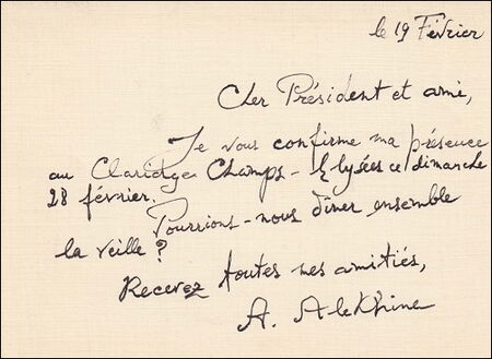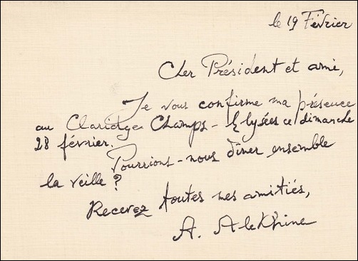 A letter written by Frank Marshall to Rufus Stevenson dated January 1913 fetched €325, while a brief five line message written by Alekhine in French sold for €653.