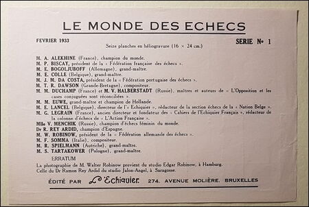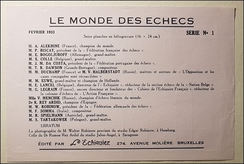 - Le Monde des Echecs. Published by L'Echiquier in Brussels in 1933, this contains 16 portraits of some of the leading chess personalities of the 1920s and 1930s. €87.