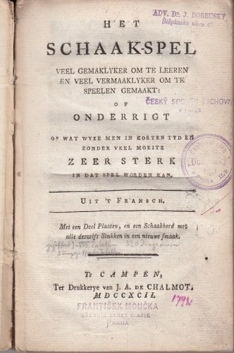 - Nouveau traité du jeu des échecs, by L. C. de la Bourdonnais, Paris 1833. Two books in one, and this copy has a handwritten game between Morphy and chess club Versailles bound between the two. This is the game against Chamouillet and allies played in November 1858. (Löwenthal page 235, Sergeant page 151, Shibut game 223). €173.