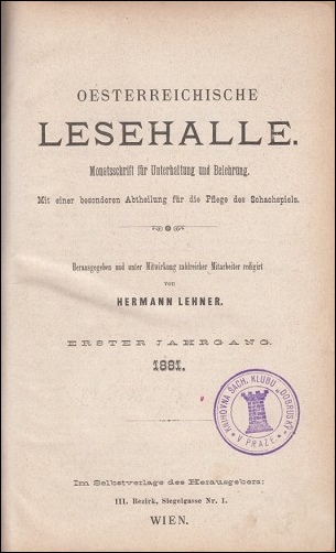 - Volumes I and II of Oesterreichische Lesehalle, Vienna 1881-1882 filled a gap in someone's collection for €665. This monthly journal for entertainment and education had a chess department edited by Hermann Lehner with help from numerous contributors.