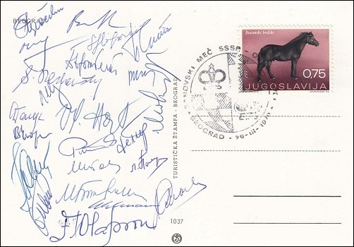 A Postcard with the signatures of 23 of the 24 players in the 1970 match between USSR and The World (Fischer's signature is missing) sold for €244.