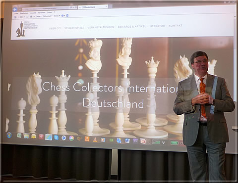 As customary, the meeting had been perfectly prepared and organized by the current German CCI chairman Wolfgang Angerstein and the former chairman Thomas Thomsen, and besides a series of promising lectures an excursion to Luxemburg was on the programme for paying a visit to the home of CCI member Reinhard Egert who owns a fascinating collection of chess sets. Nicholas Lanier has already published a detailed report on the whole event, so I will confine myself to give a selection of photos.