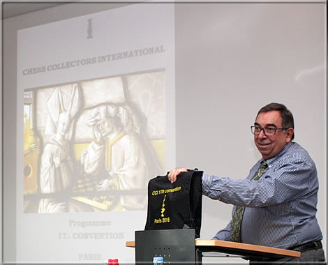 Michael Wiltshire, CCI President Great Britain (on the right, with Nicholas Lanier), spoke about a very early (Habsburg) travel chess set, bearing the inscription "Pressburg 1830". -