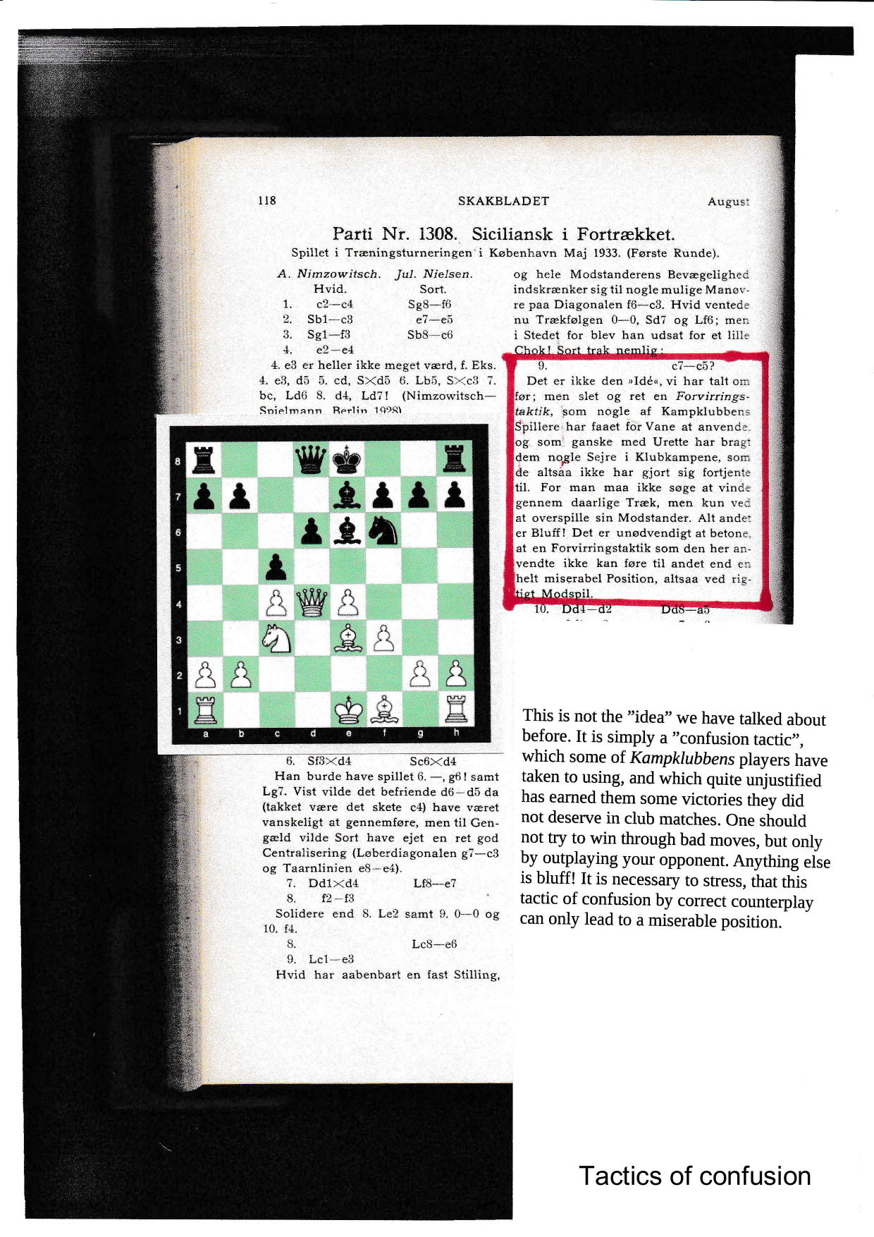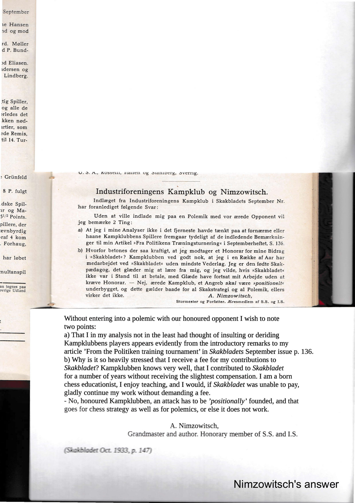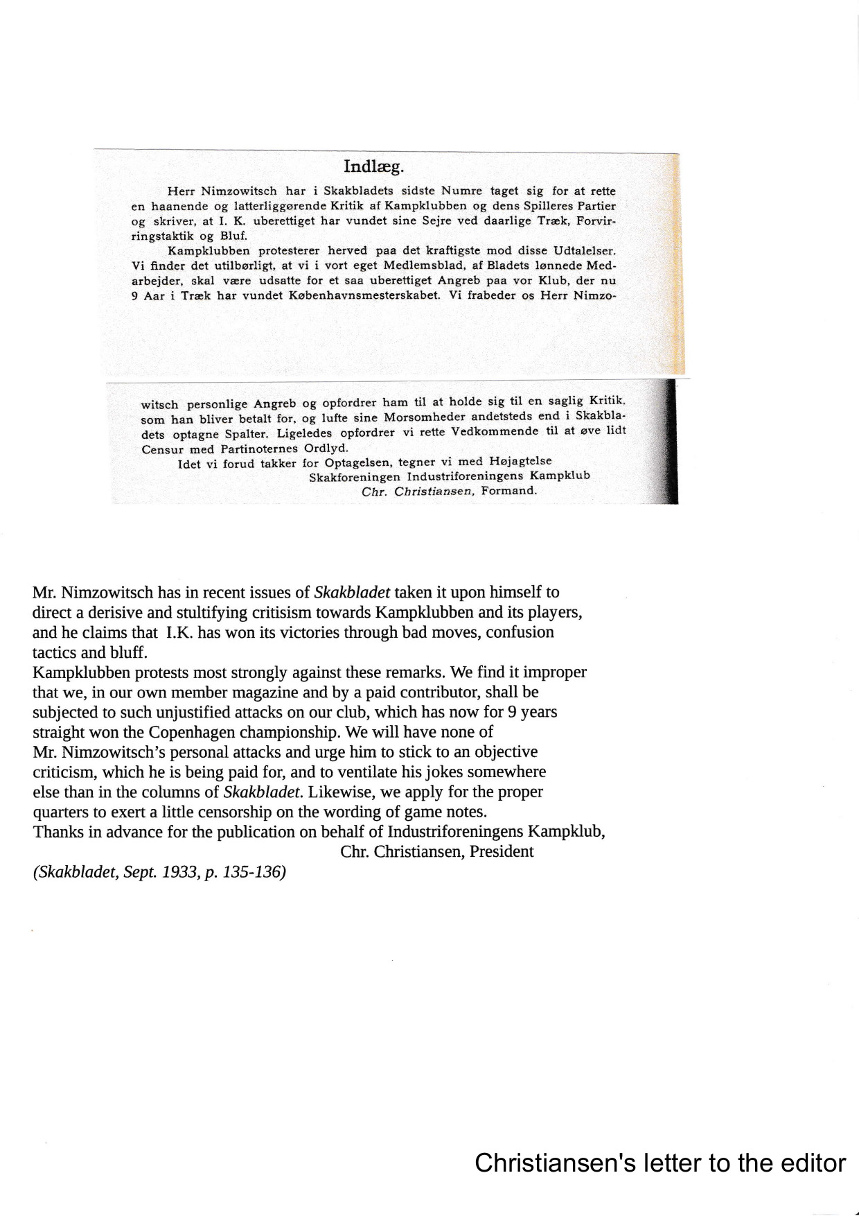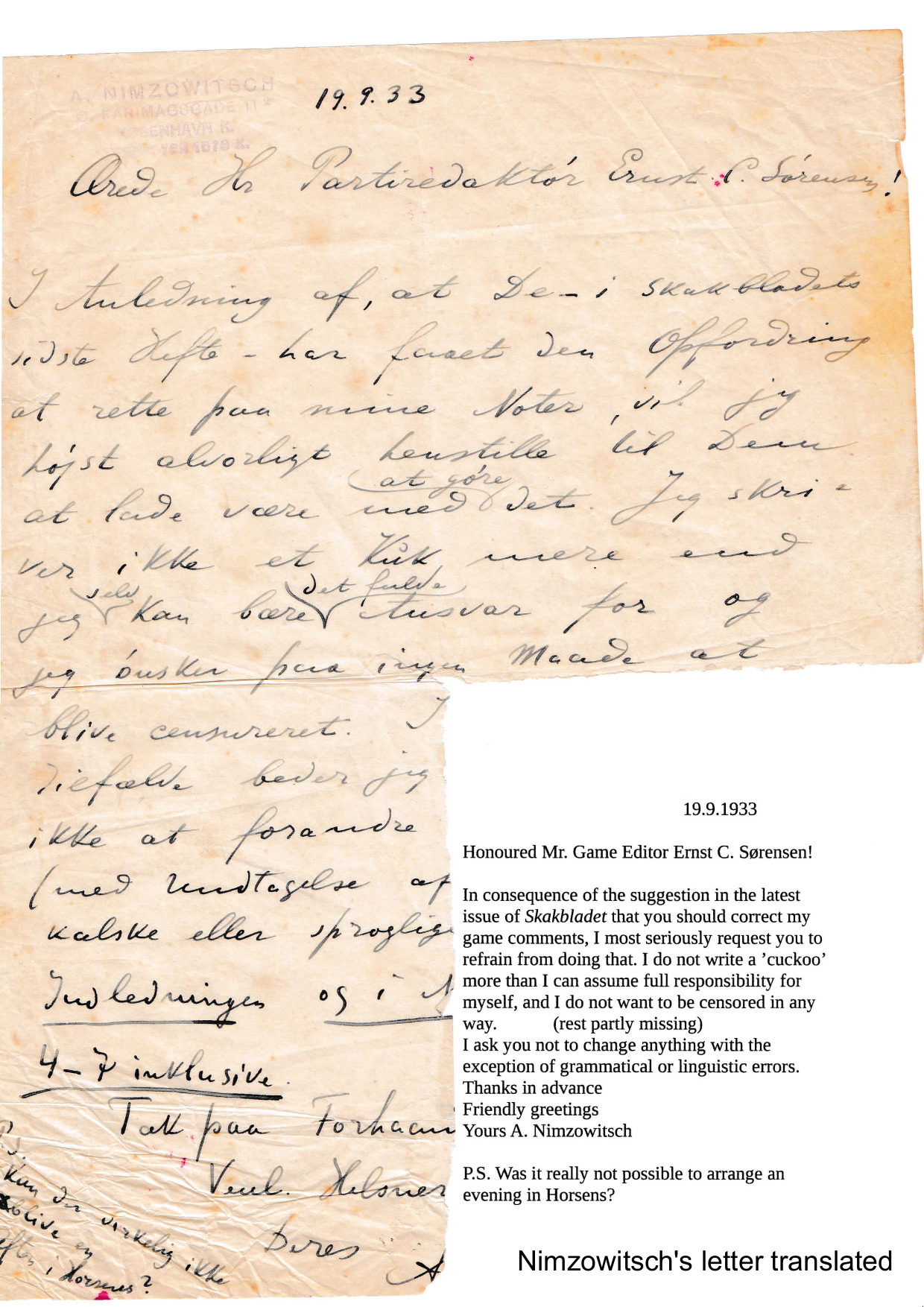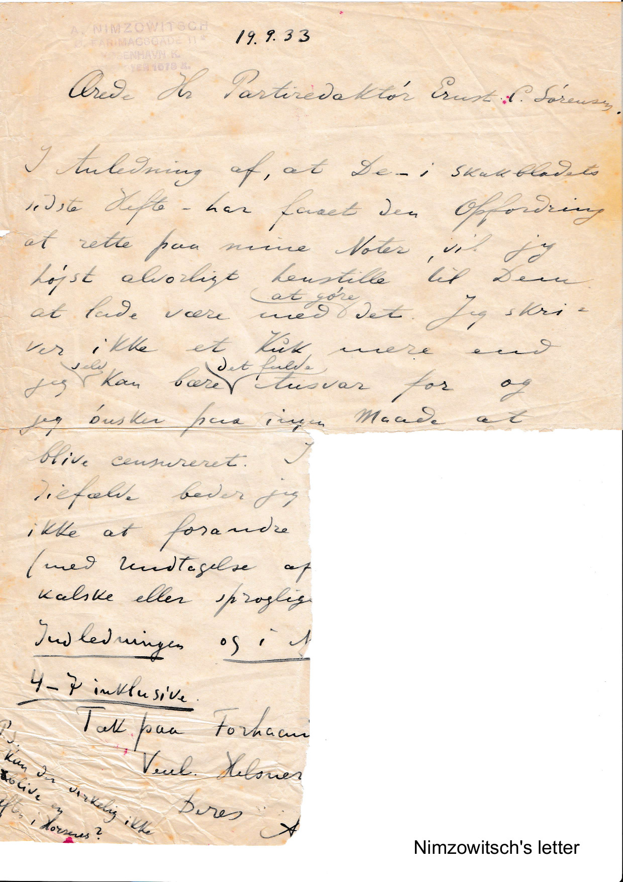 After the coffee break, the Secretary-General of the Society, the Dane Claes Løfgren presented a letter from Nimzowitsch to the editor of a Danish Chess Journal. In a previous edition, Nimzowitsch criticised a questionable move in a game played by himself against a fellow Dane. When the President of the chess club, whose players had come under fire, protested against the remarks, he went so far as suggesting that the editor of the journal should exercise some scrutiny. This, in turn, triggered the grandmaster to warn against any sort of censorship in chess journals in typically Nimzo-writing style.