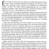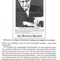 On "Chess in San Francisco" and also on the Mechanics’ Institute’s Chess Room reports Edmund Lomer in his article in Schachkalender 1997, Edition Marco, pages 112-115 (in German only, see below).