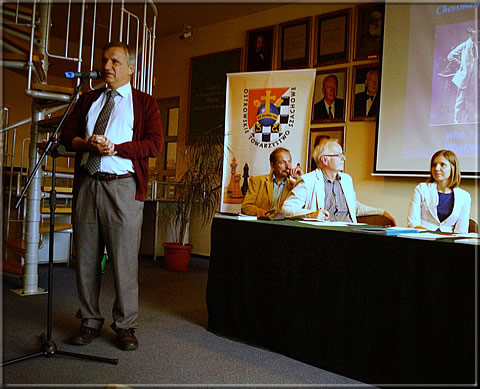 Nevertheless Paweł (as he claims himself) has been inspired by works of other authors, too. Tomasz mentioned that a trio of chess authors – Fred van der Vliet, Prof. Tadeusz Wolsza and Prof. Andrzej Kwilecki, all absent in Ostrów – may have inspired Paweł more or less. He gave a short introduction of those authors and explained their contributions to the history of chess.