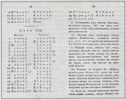 A basic primer of 39 pages was published in Moscow in 1828; The Rules of the Chess Game, (Sakharov 3). No author is named. This gave the arrangement and movement of the chess pieces, the aim of the game, notation, general notes on the conduct of the game, and a game between Philidor and Count Bruhl.