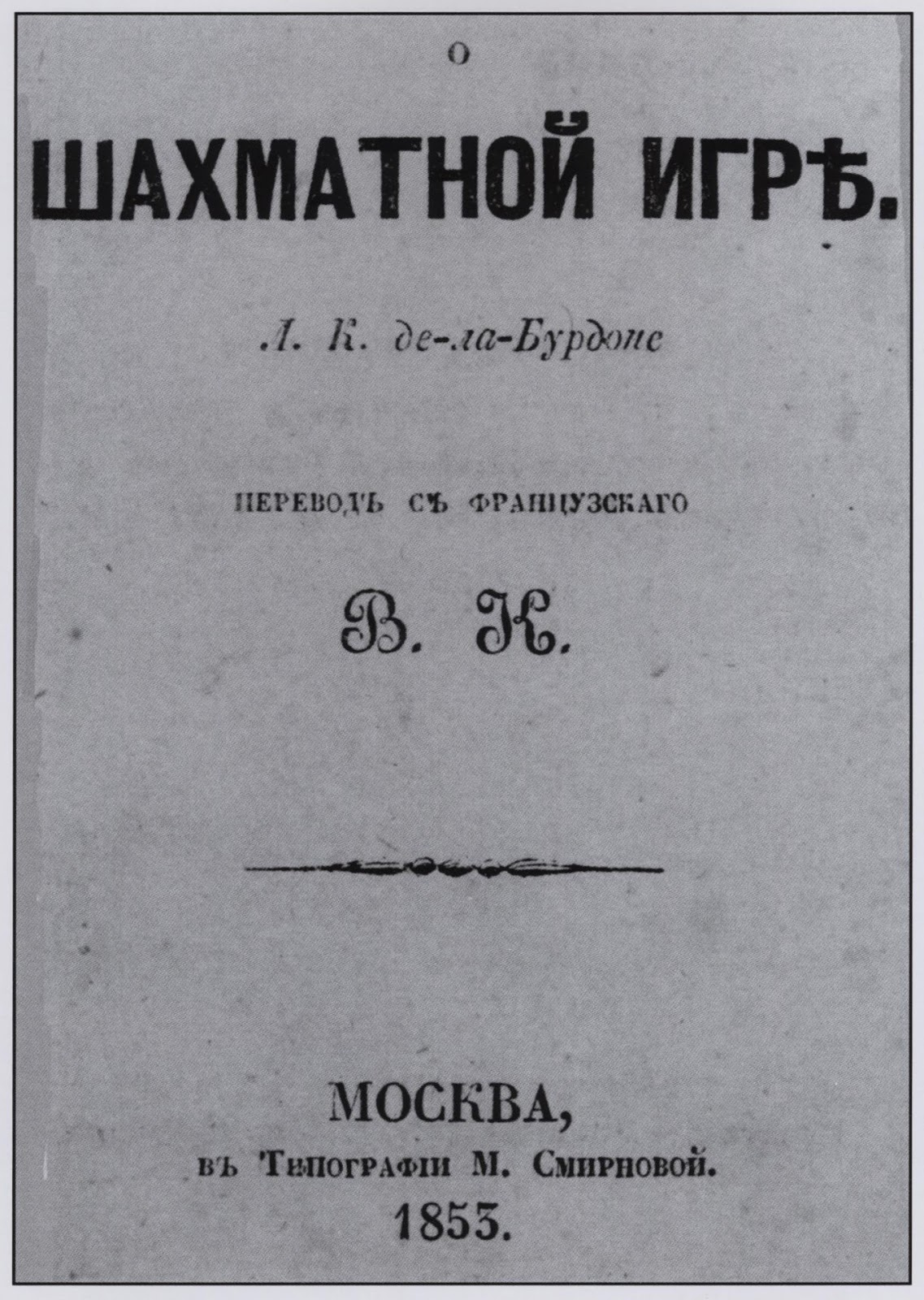 A Russian translation of Nouveau Traité du Jeu des Échecs by La Bourdonnais was published in Moscow in 1839. Petrov reviewed this book in the Russian Literary Gazette in 1840 and introduced the concept of “the art of chess” on account of its inexhaustibility and creative possibilities. A second edition was published in Moscow in 1853.