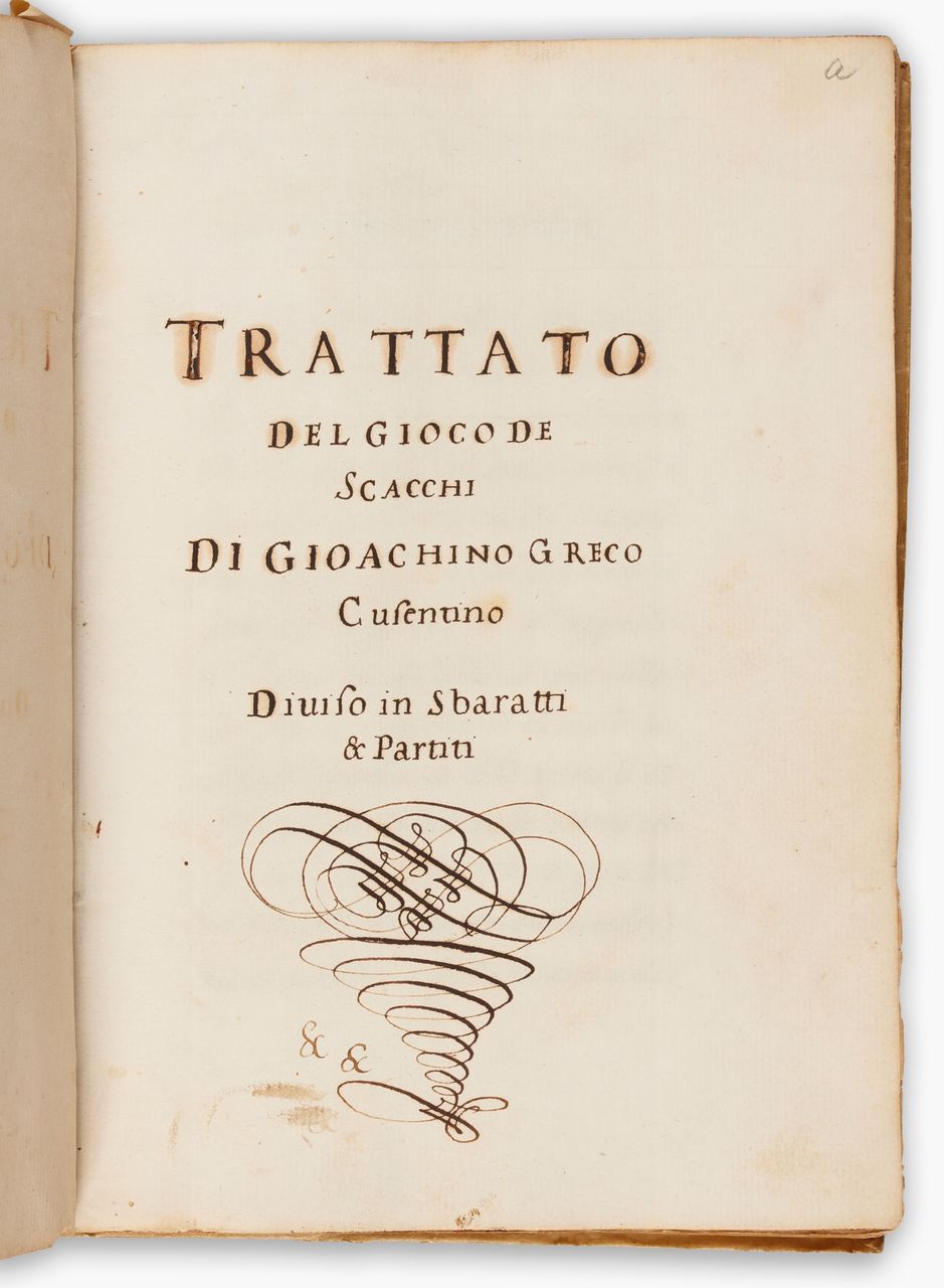The presentation manuscript of Gioachino Greco’s Trattato del gioco de scacchi (Rome, 1620), the so-called Corsini manuscript, extensively discussed by Alessandro Sanvito and others, including Peter J. Monté in The Classical Era of Modern Chess (2014, p. 324), realised £115,200 (hammer price £90,000).