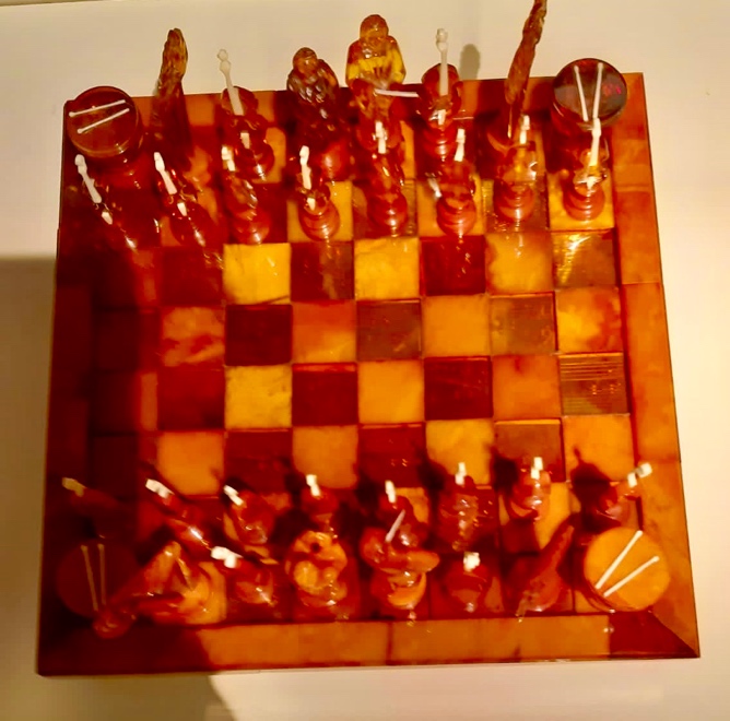 And, who can claim to have ever seen the "Amber Figure Set" [catalogue pp. 104-105] from the Dr. Thomas Thomsen Collection? [Update 2022-12-05] (We owe the following information to Ms. Barbara Holländer: the sentence "not quite true", she writes and reminds us that on the cover of KARL issue 4/2007 on the subject of chess and music, some figures from the set are shown. Also to the essay by your husband, Hans Holländer (and other authors) entitled Chess and Music in this issue. In addition, she writes, there was an exhibition on chess and music in Berlin in 2006 that has apparently been forgotten. Susanna Poldauf also worked on this with the Holländer family. There was no catalog in 2006.) [/Update] This unique piece was made by the chief restorer of the Amber Room in the Catherine Palace near Saint Petersburg - Alexander Krylov. For over 30 years he has been the amber master of the highest category in Russia.