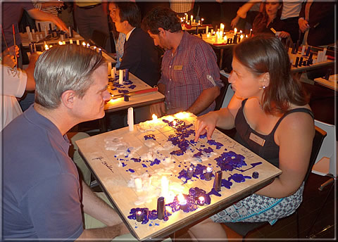 In the early evening the Burning Boards performance followed, organized by Larry List together with the multimedia artist Glenn Kaino (Los Angeles). 16 chess players/artists (among them Rex Sinquefield and further members of the CC&SC) competed against 16 artists of all genres. Some photos will illustrate this great event – the result of a game was strongly dependent on the speed the candles burned down. Anyway, it was a lot of fun for the participants and the numerous spectators as well.