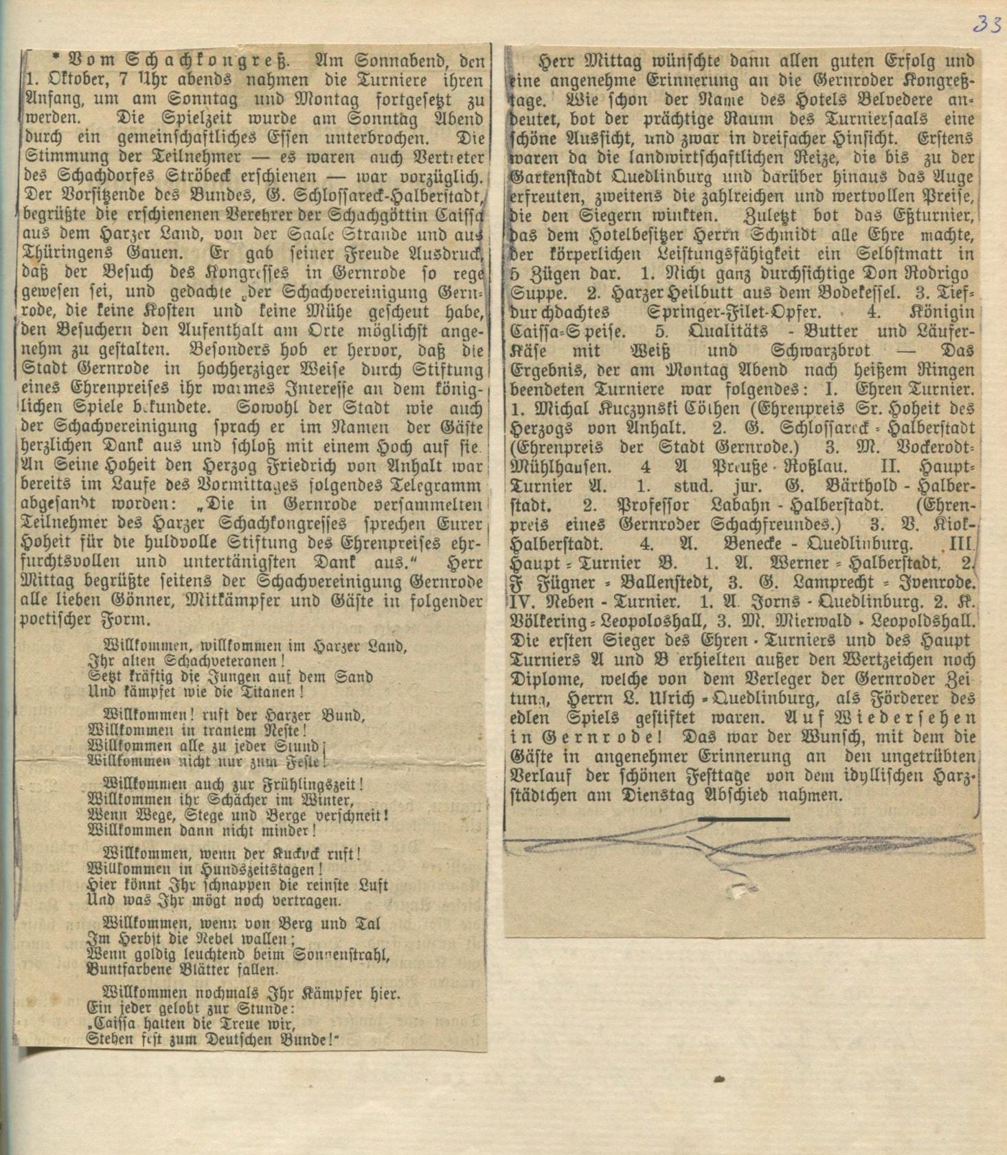 „Erste constituiernde Generalversammlung des Harzer Schachbundes vom 3. Mai 1882.“