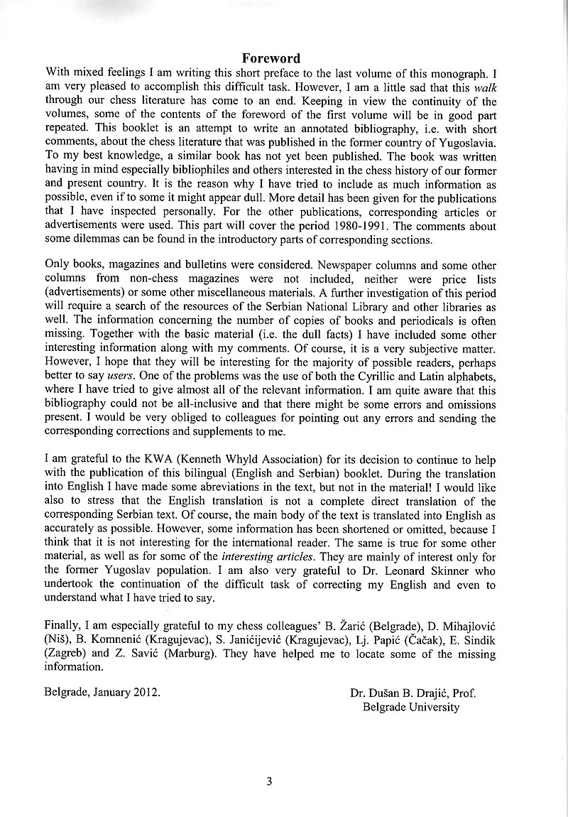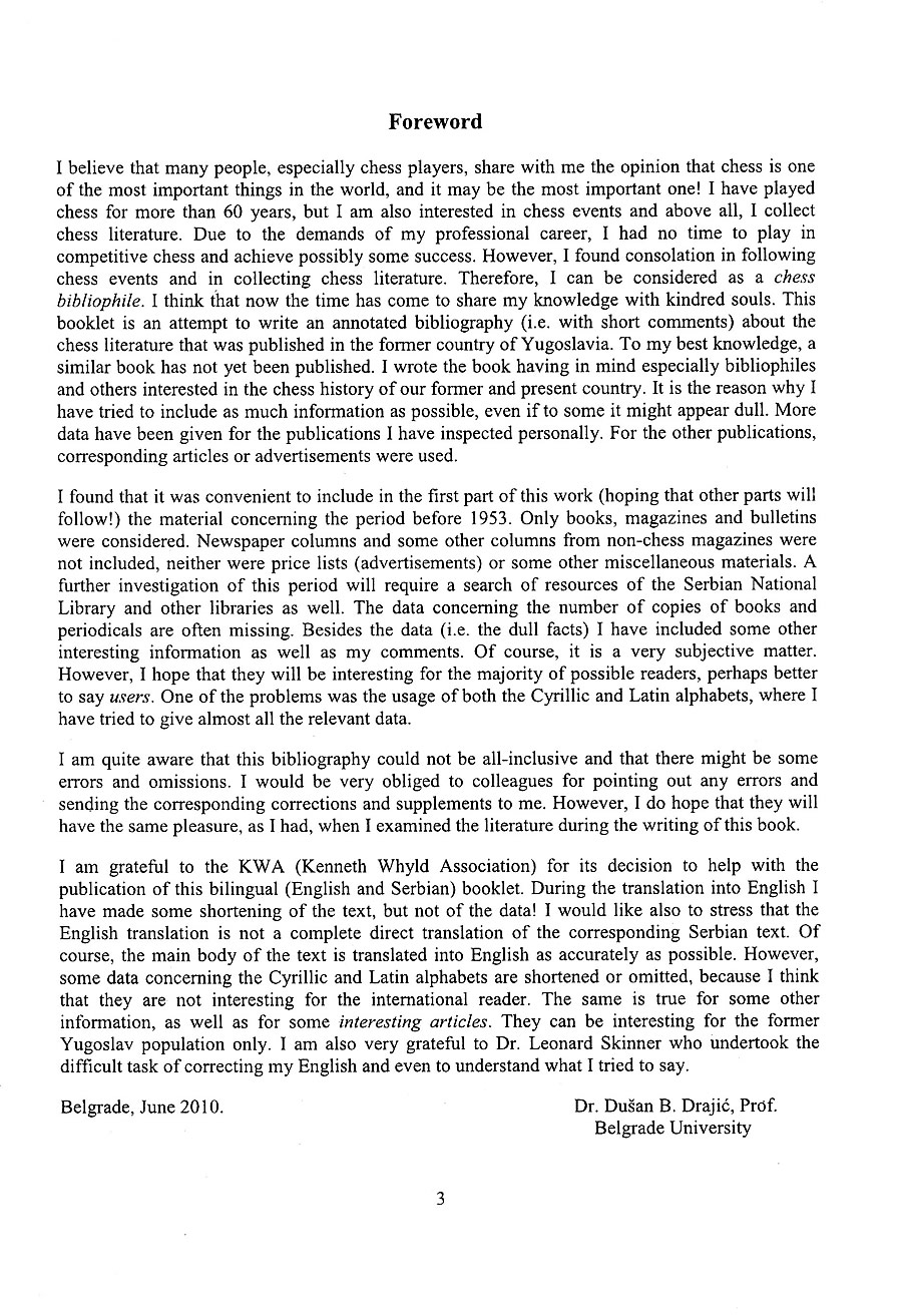 Prof. Dušan B. Drajić from the Belgrade University had just joined our association (in March 2010) when he announced his new bibliographic project, and he has since pursued it with a remarkable determination and energy. His intention was a 4-volume bibliography of the Yugoslavian chess literature from 1886 to the present in a bilingual edition (English/Serbian), and already shortly after midyear 2010 he could present the first volume of the planned work. As per decision of the KWA board it was given as a gift to our members.