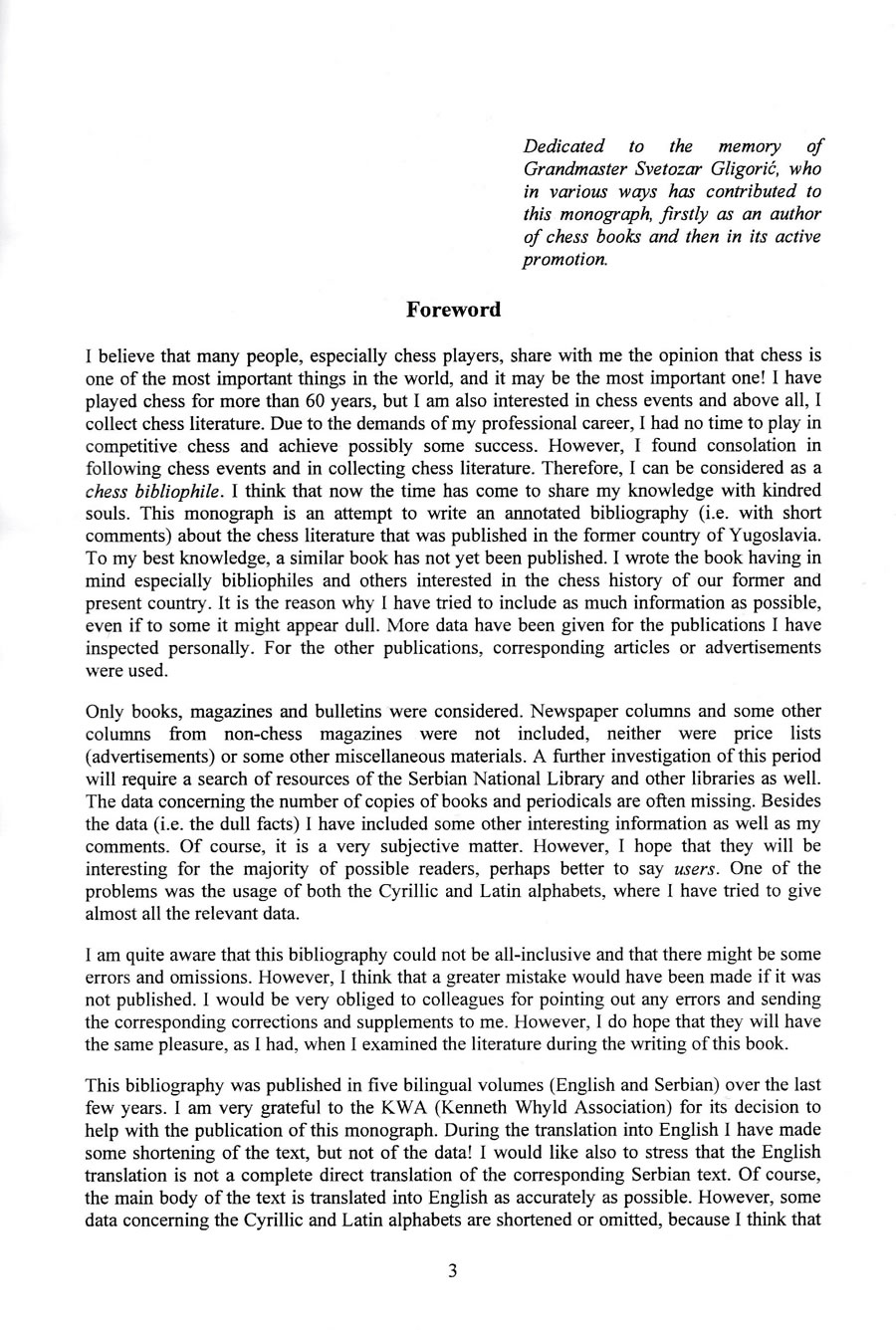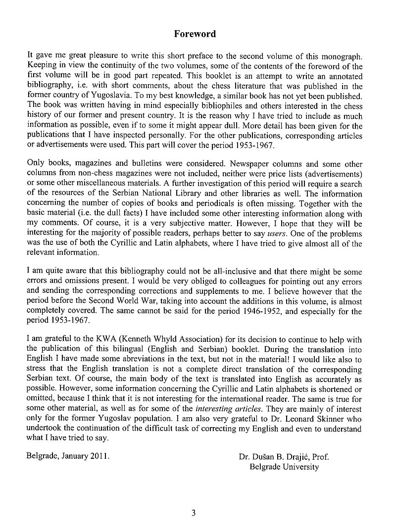 Dušan B. Drajić has realised his work with high commitment in a surprisingly short time (- we have no doubts that part III will be "timely" available to us as well) and has acted here as author, translator, designer, producer and distributor in one person! His bibliography is an additional "building block" of the complete bibliography of chess literature worldwide. Here we have to appreciate as well the valuable cooperation of our Welsh member Leonard Skinner who has exemplarily finished the proof-reading of the English parts of volume I and II.