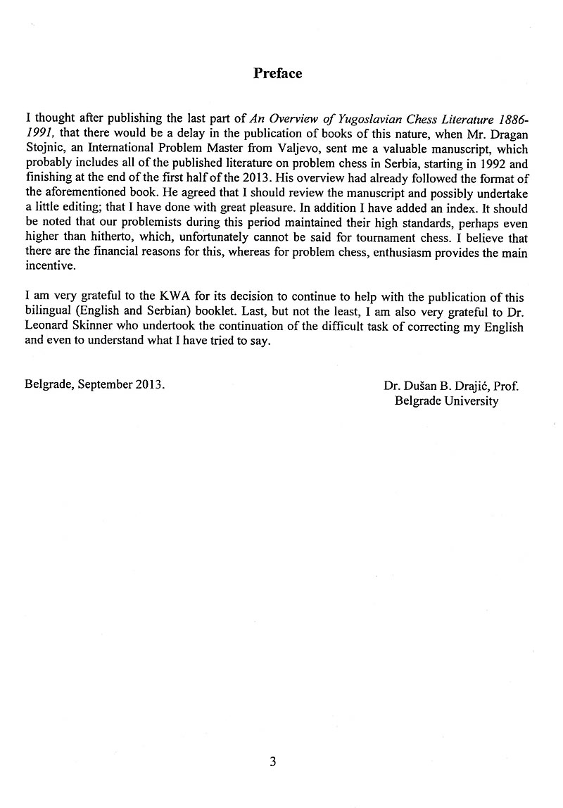 As a supplement to the series we can present a booklet by Dragan Stojnić, containing a bibliography of Serbian problem chess literature from the period 1992-2013. It is bilingual (English and Serbian) as well, and Dušan Drajić has provided a preface.