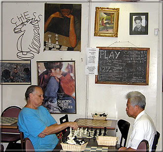 Auf der gegenüber liegenden Straßenseite besuchten wir das Chess Forum, wo mehrere den Versuch unternahmen, über ein paar Bilder zu verhandeln, die an der Wand hingen.